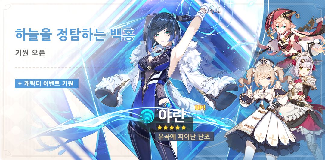★5 캐릭터「야란(물)」의 기원 획득 확률 UP ★4 캐릭터 「바바라(물), 「연비(불)」, 「노엘(바위)」의 기원 획득 확률 UP |