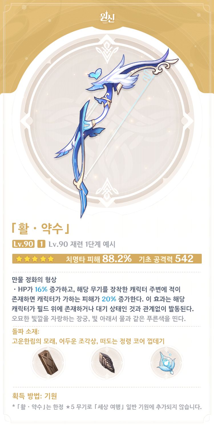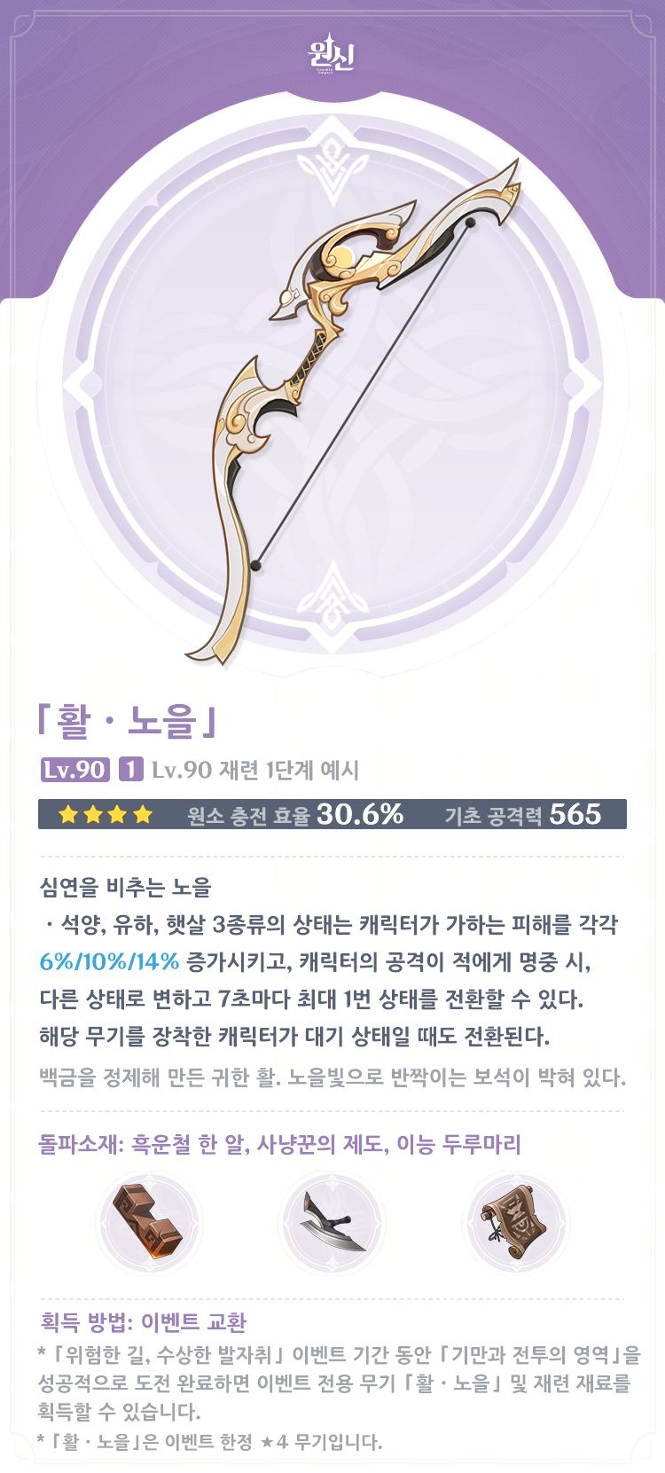 | 신의 주조 | ★5 무기 「활·약수」, 「장병기·화박연」의 기원 획득 확률 UP ★4 무기 「장병기·천암 장창」 , 「한손검·제례검」, 「양손검·페보니우스 대검」, 「법구·소심」, 「활·제례활」의 기원 획득 확률 UP |