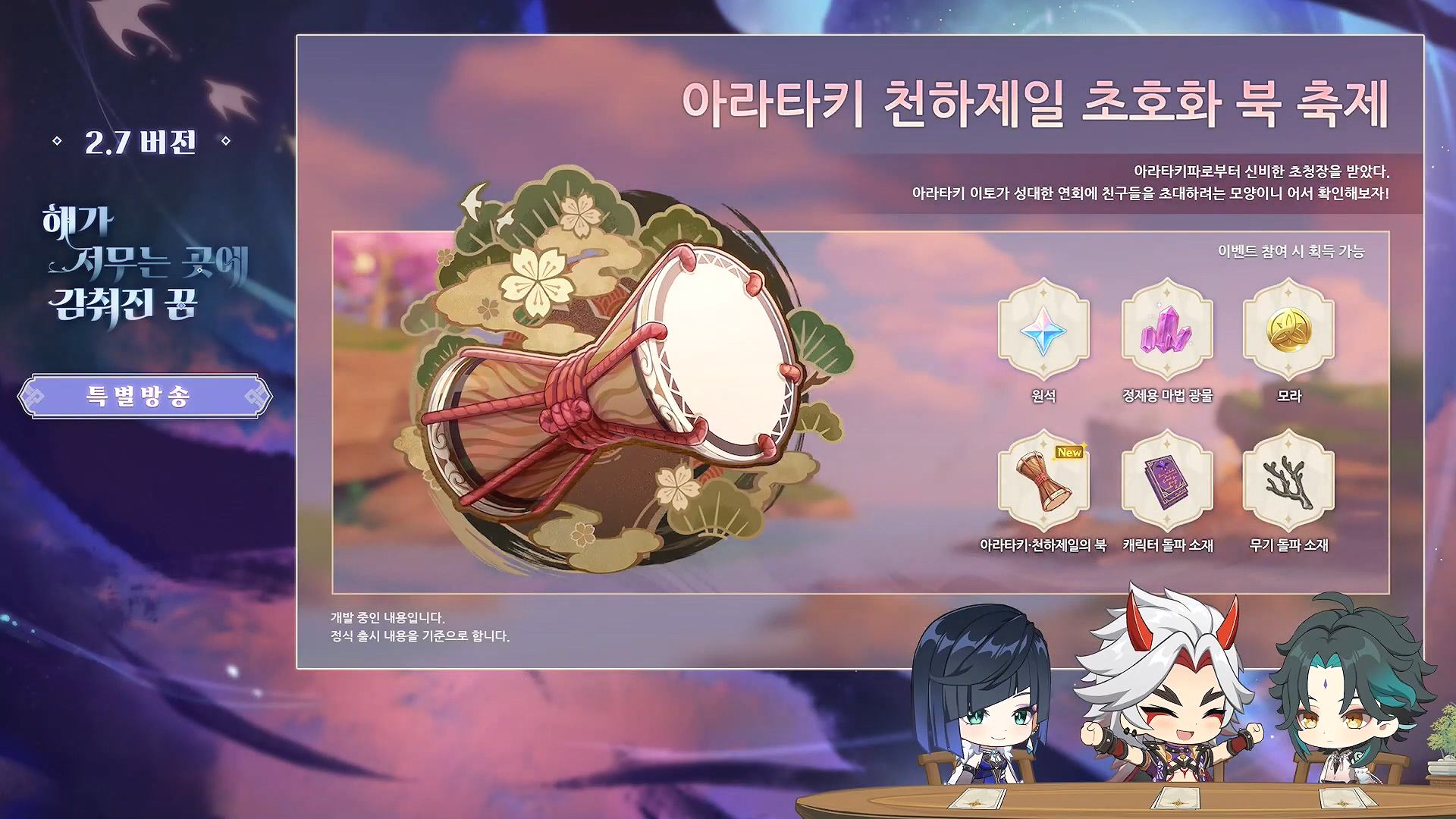 - 이벤트 기원 - 2.7 버전 첫 번째 이벤트에서는 신규 캐릭터 「야란」과 「소」의 확률이 대폭 UP, 두 번째 이벤트에서는 「이토」와 그의 부하 「쿠키 시노부」가 확률 대폭 UP, 또한 ★5 활 「약수」도 무기 이벤트 기원에서 등장할 예정.