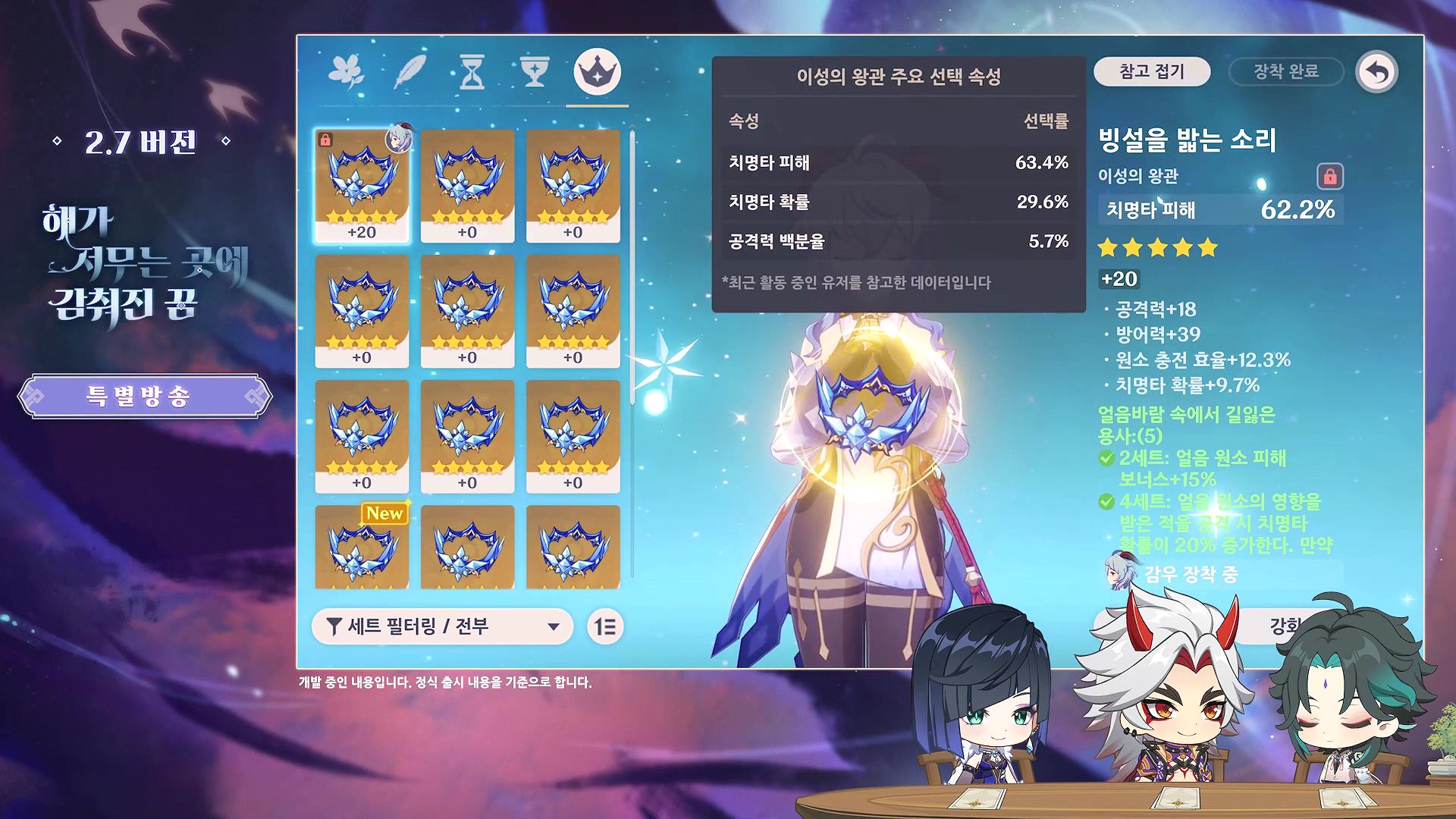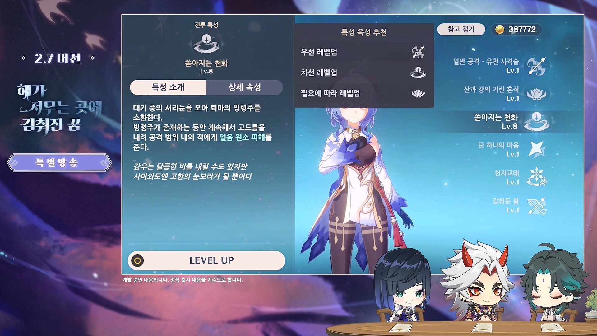 - 캐릭터 육성에 대한 힌트 추가 - 캐릭터 육성 화면에서 새롭게 추가된 「특성 참고」 버튼을 누르면 여행자들의 실제 육성 데이터를 종합해서, 특성의 육성 우선순위를 추천한다. 또한 캐릭터 장비의 성유물 화면에서 「속성 참고」를 누르면 각 부위별 성유물의 주 속성 사용률 통계를 볼 수 있다.