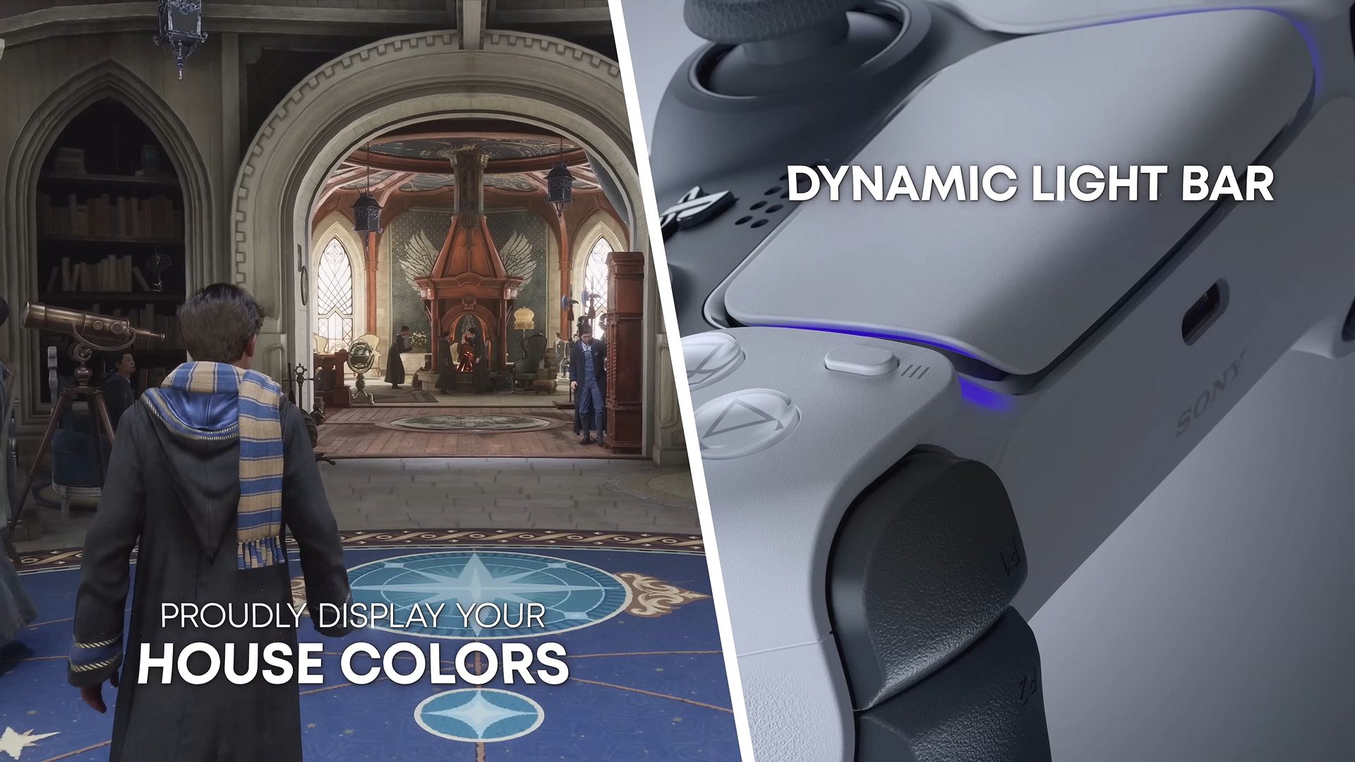 - 또한 듀얼센스의 펄스 라이트 기능을 사용하여 고유한 개인 설정을 제공합니다. 주문이나 데미지를 입히는 동안 듀얼센스의 불빛은 여러분이 속해있는 기숙사 학원의 색상으로 빛납니다. '레이븐클로'는 파란색과 청동색, '그리핀도르'는 주홍색과 금색, '슬리데린'은 녹색과 은색, '후플푸프'는 노란색과 검정색으로 말이죠.