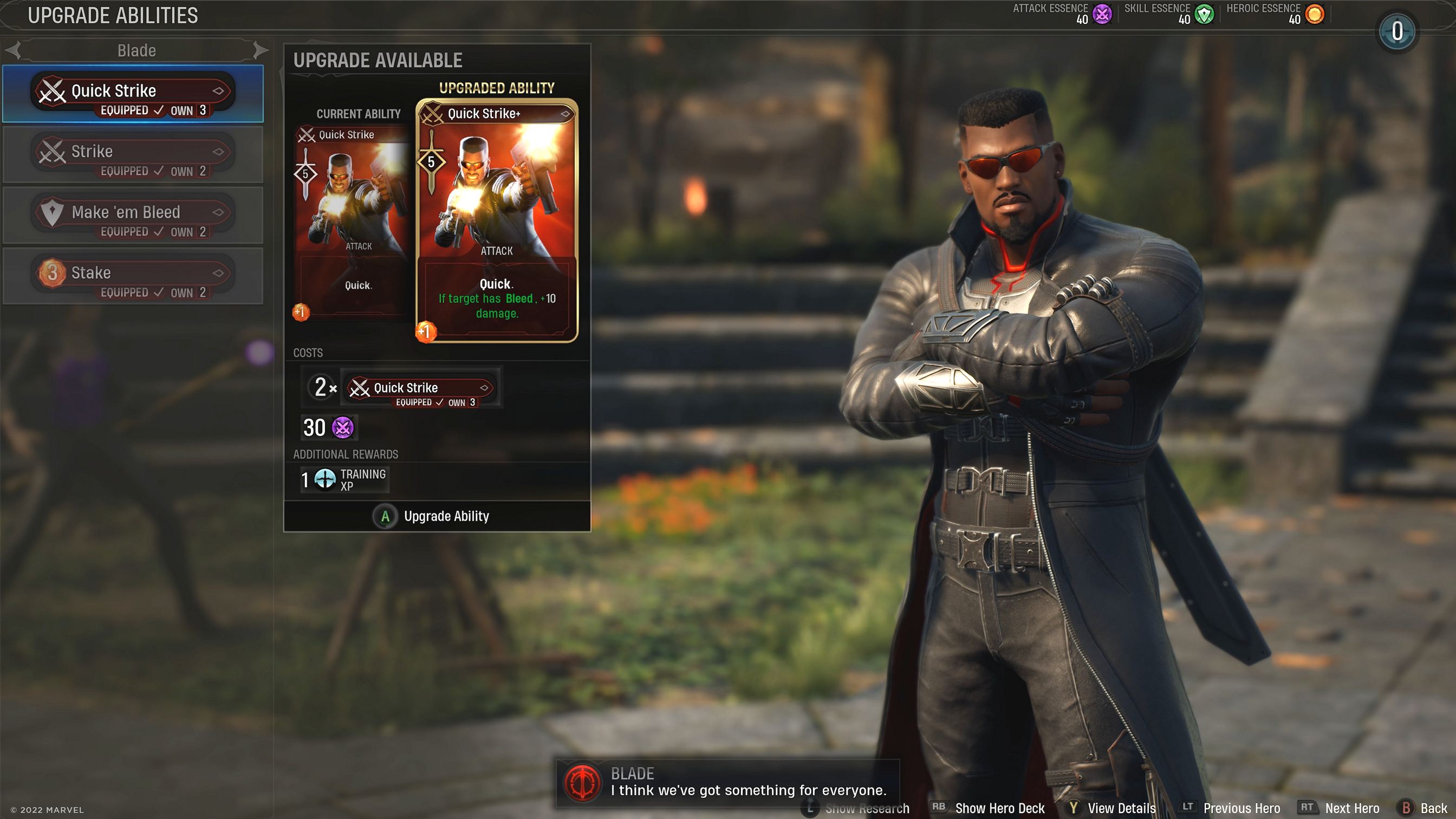 - 캡틴 아메리카(미래 병사) - 캡틴 아메리카(경비대 대장) - 캡틴 마블(마-벨) - 캡틴 마블(중세 마블) - 매직(피닉스 5) - 매직(새 뮤턴트) - 니코 미노루(시스터 그림) - 니코 미노루(그림자 마녀) - 울버린(엑스포스) - 울버린(카우보이 로건) - 블레이드(데몬 헌터) - 블레이드(블레이드 1602) - 아이언 맨(아이언 나이트) - 아이언 맨(블리딩 엣지) - 고스트 라이더(복수의 화신) - 고스트 라이더(죽음의 기사) - 닥터 스트레인지(스트레인지 퓨쳐 슈프림) - 스칼렛 위치(대장 마녀) - 스칼렛 위치(타락한 스칼렛 위치) - 스파이더 맨(심비오트) - 스파이더 맨(악마) - 발표되지 않은 히어로의 추가 스킨 - 발표되지 않은 히어로의 추가 스킨 |