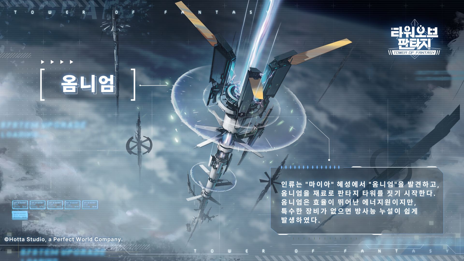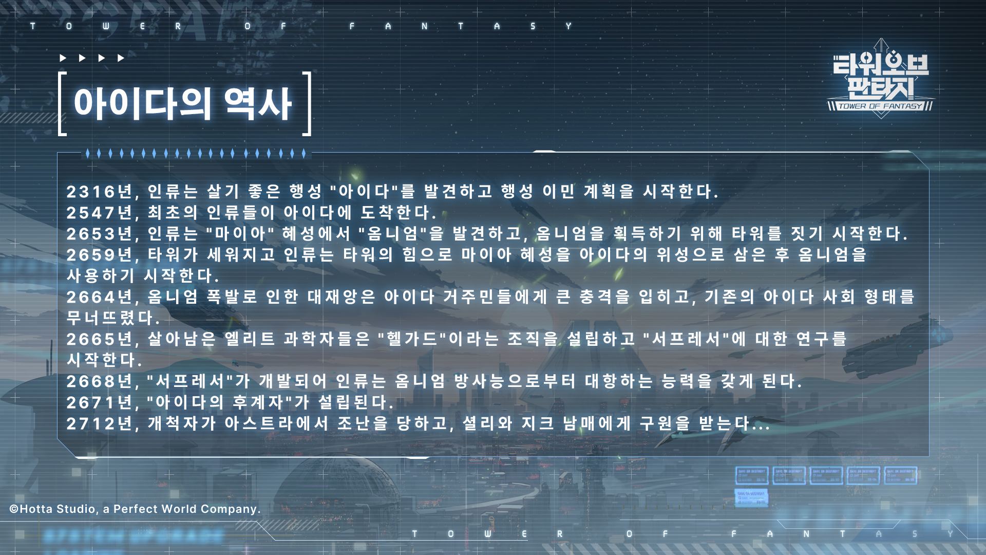 - 타워 오브 판타지는 어떤 게임? - 「타워 오브 판타지」는 중국 개발사 퍼펙트 월드 산하의 Hotta 스튜디오가 개발한 SF 판타지 오픈월드 액션 MMORPG 게임. 원신과 비슷한 애니메이션풍의 카툰 렌더링 그래픽과 방대한 오픈월드 탐색이 특징이며 '방사선'으로 오염된 지구 외행성 「아이다」를 배경으로 플레이어는 '개척자'가 되어 활동하며 돌연변이 생물과 적대 세력과 싸우는 이야기가 그려진다.