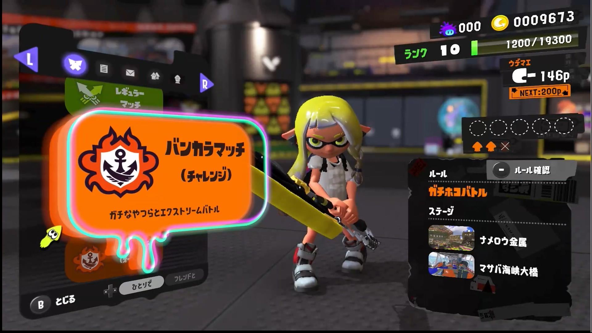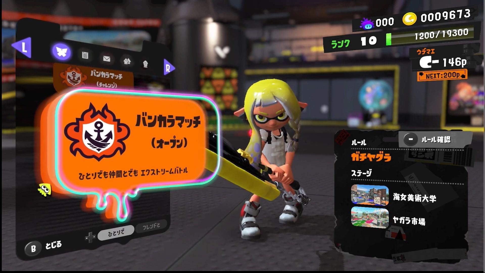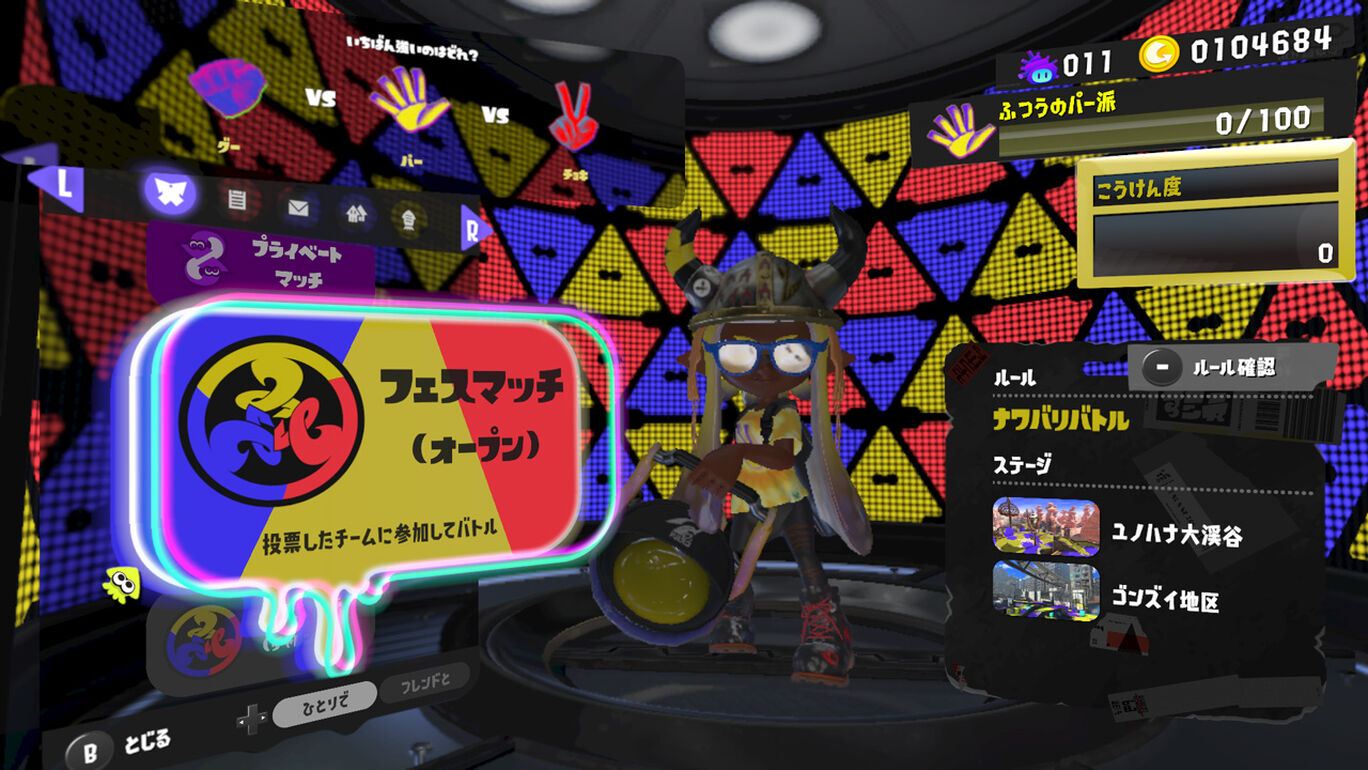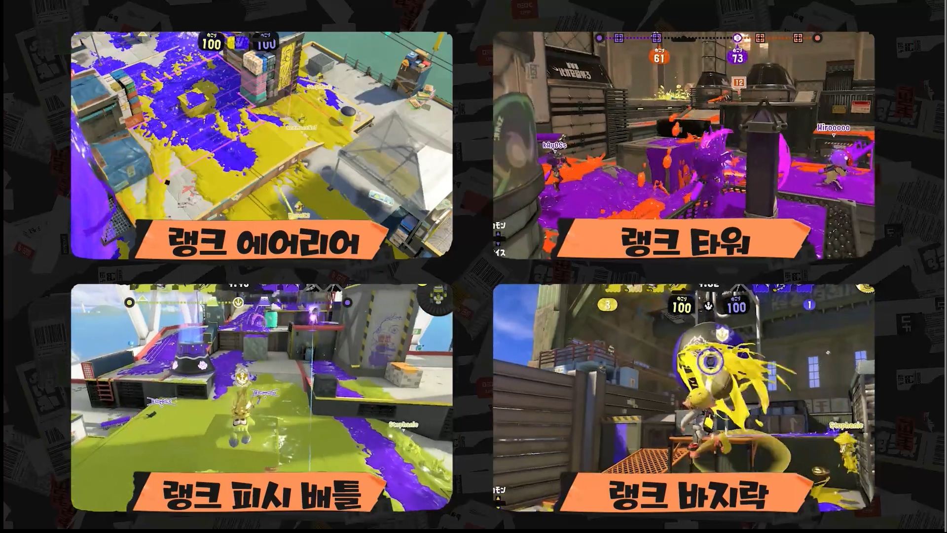 - 랭크 대전 - '영역 배틀'과는 다른 4개의 규칙으로 배틀하는 랭크 대전 모드로서, 챌린지/오픈 두 부문으로 나뉘어 승패로 랭크가 변화한다.