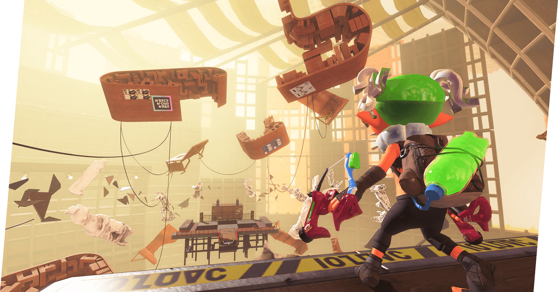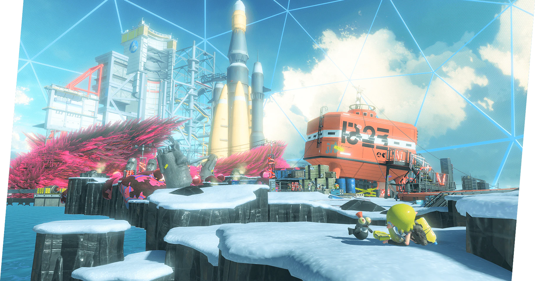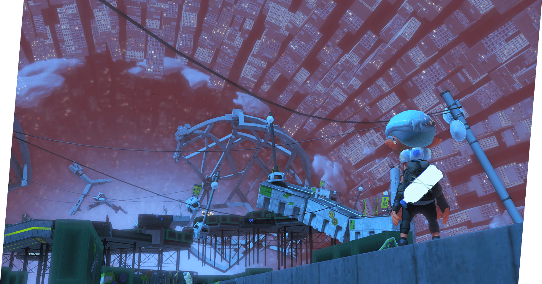 - 게임 무대는 오징어와 문어 등 진화한 해양생물들이 사는 땅 「카오폴리스」지방. 그 중심지인 '카오폴리스 거리'는 최근 급속히 발전하면서 다양한 시대의 건축물들이 서로 어우러진 독자적인 문화가 형성되어 있다. 트렌드에 민감한 젊은이들도 이 화제의 거리에 몰려들고 있으며, 배틀이나 쇼핑 등 여러 활동을 할 수 있다.