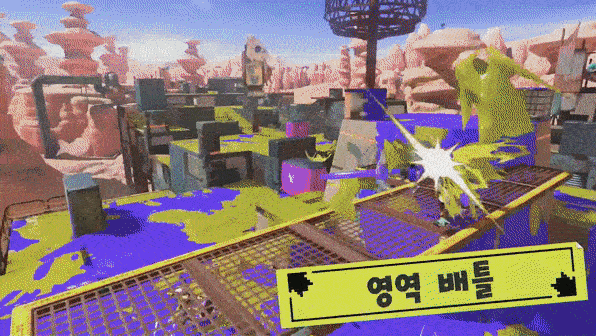 - 4인 1조의 팀을 짜고 얼마나 상대를 처치하는 것이 아닌, 지면을 자신의 팀 색상 잉크로 얼마나 칠했는지, 그 면적을 겨루는 것이 「영역 배틀」이다. 게임을 시작하면 공중에서 지상으로 강하해 3분간 동료와 협력하면서 영역을 칠해간다. 3분이 지나면 게임 종료, 최종적으로 상대 팀보다 많은 영역을 칠한 팀이 승리한다.