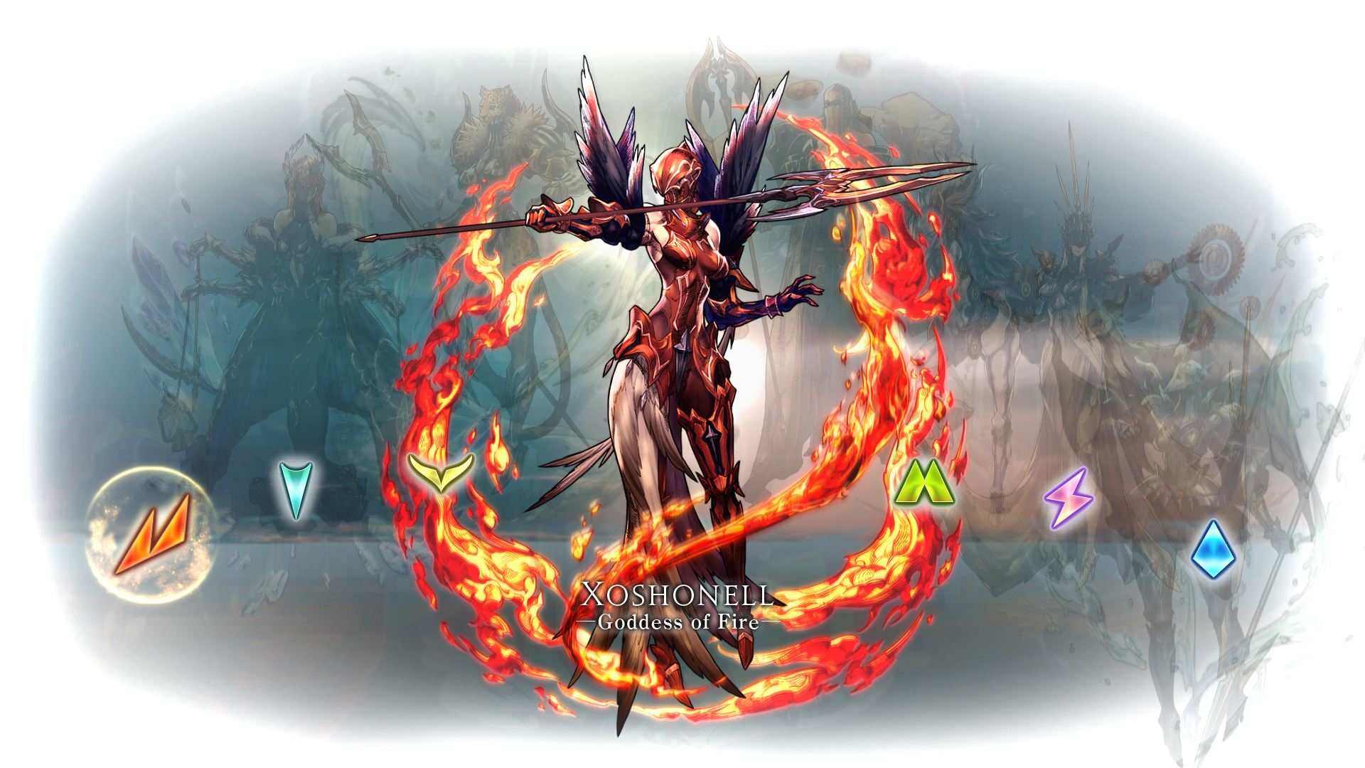 - 구름의 신 '아란다'와 정의의 여신 '페르아나' 사이에서 태어난 천둥을 다스리는 여신. 심판의 신으로도 알려져 있으며, 주의에 떠있는 톱니바퀴는 질서를 의미한다. 오우거 배틀에서는 불의 신 '조쇼넬'과 함께 중립을 유지하였으며, 전쟁 종결 후 그녀의 심판으로 마계에 봉인된 오우거는 수천만이라고도 전해진다. 발레리아에서도 오랜 세월 그 평등함, 공정함 때문에 괴롭힘을 당한 백성들이 숭베하는 경우가 많으며, 패왕 '도르가르아'가 '필라하'를 유일신으로 통일하고 종교를 만든 후에도 여전히 숨어 신앙받은 대상으로 알려져 있다.