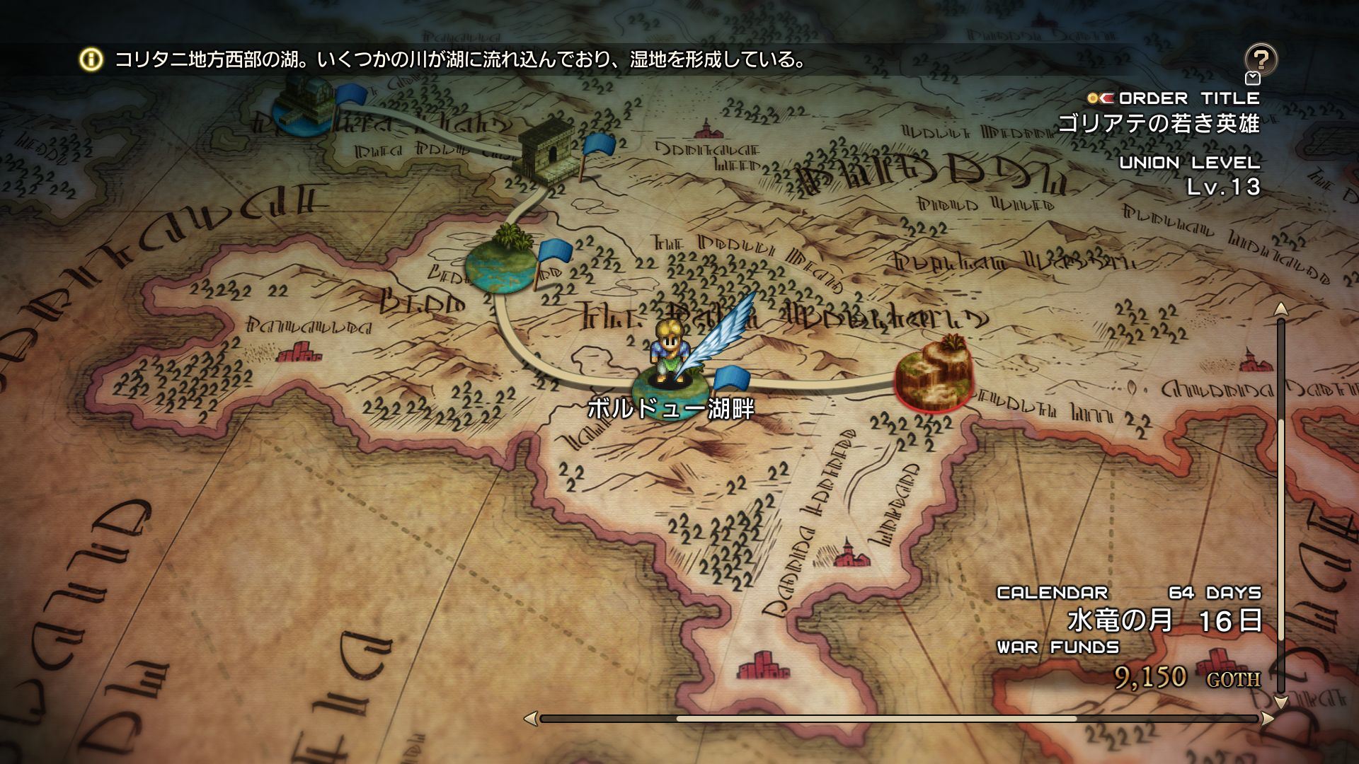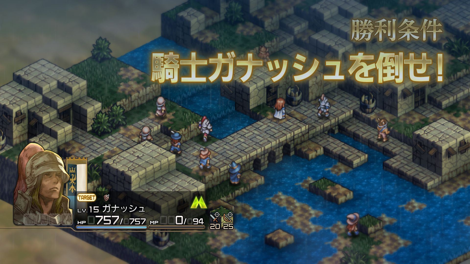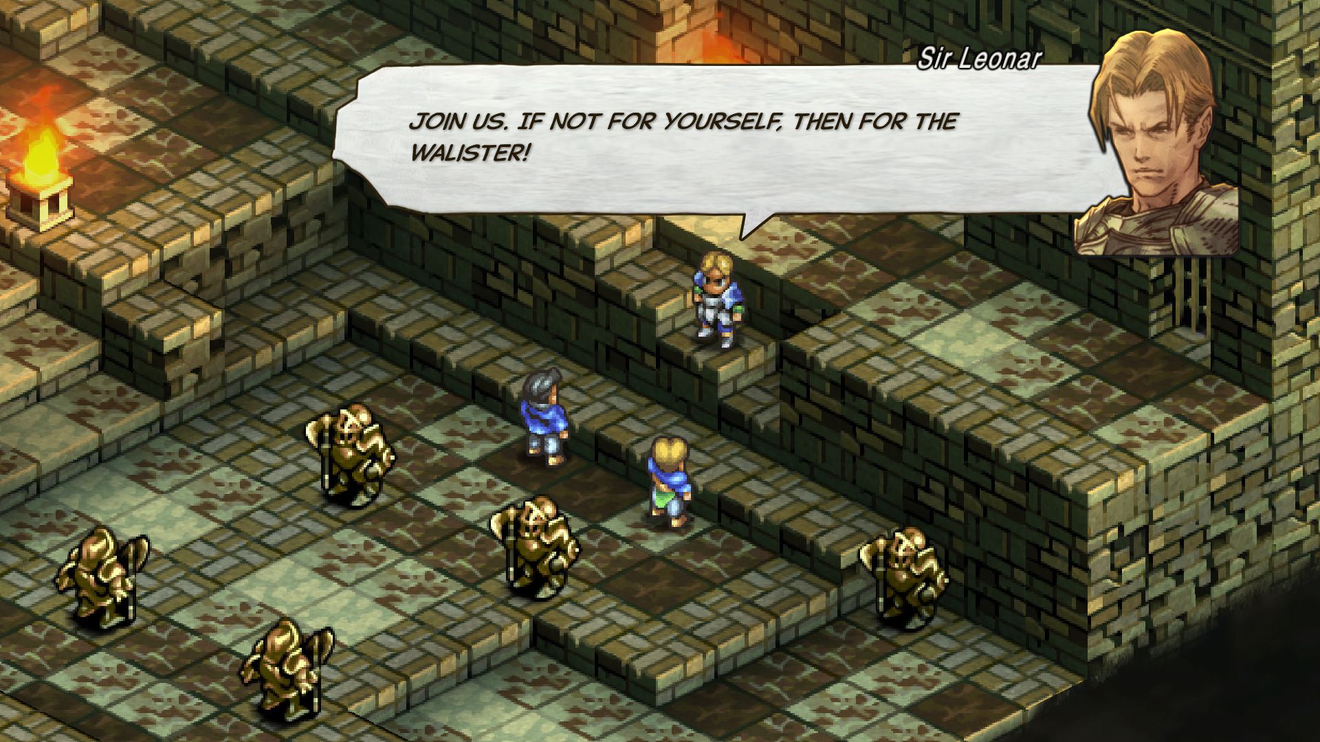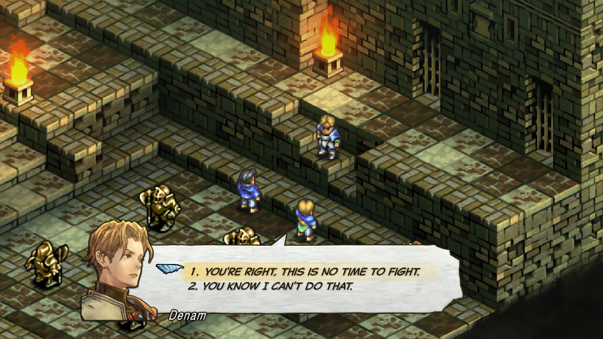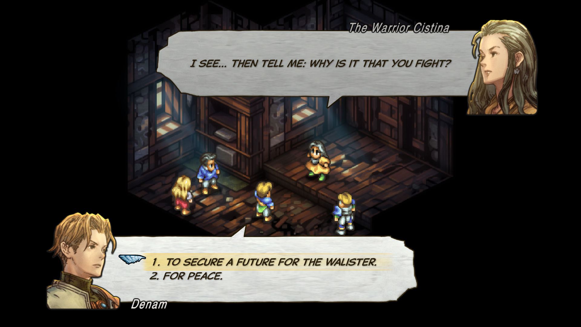 - 월드맵에서 적이 있는 거점에 들어가면 전투로 진행된다. 데님 기사단 중에서 출격 유닛을 선택하고 배치를 결정하면 출격된다. 출격 후 전투 필드 상에 아군, 적군 각각의 유닛이 배치되어 배틀이 시작된다..
