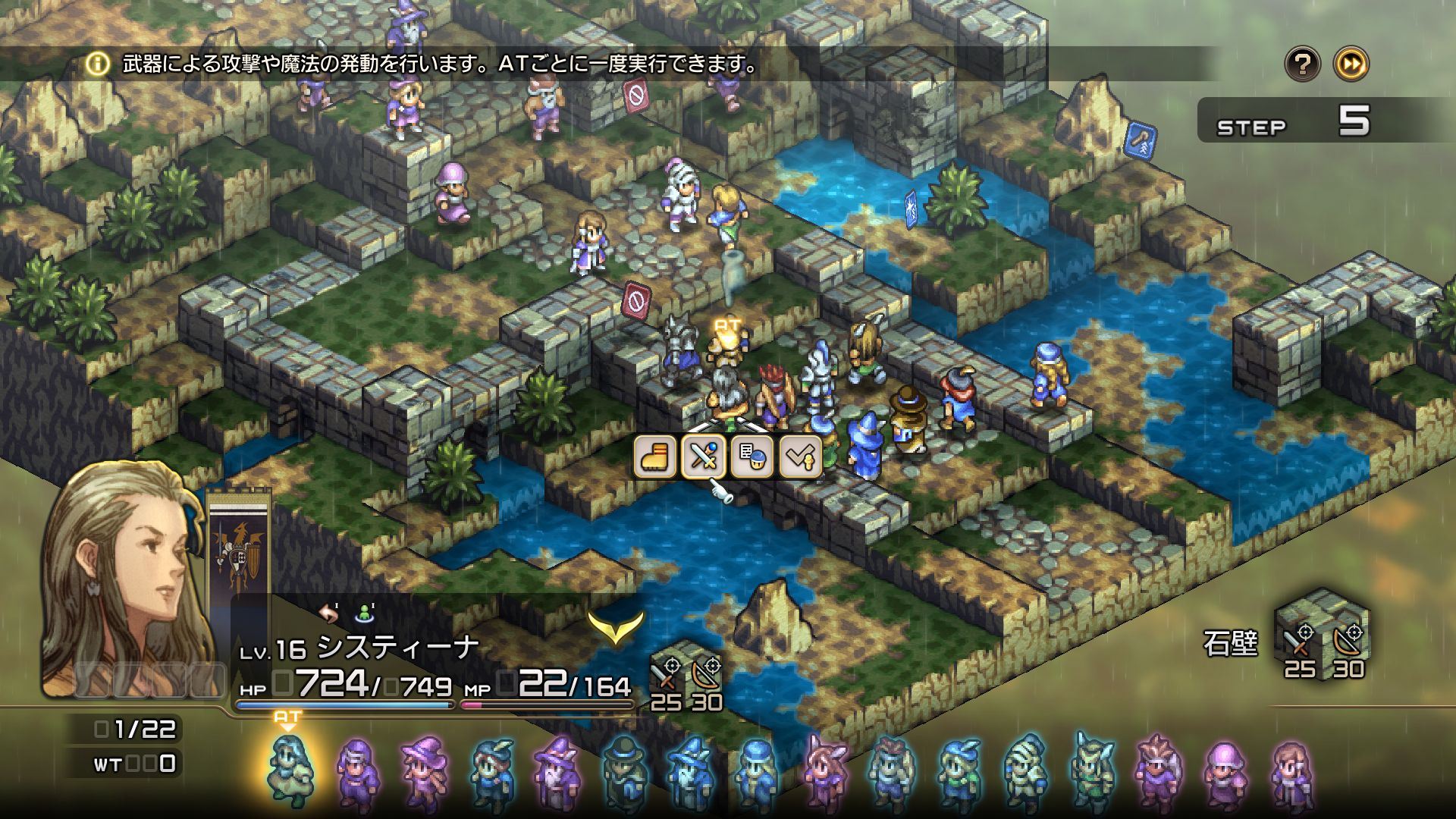 전투가 시작되면 그 전투에서의 승리 조건이 제시되고 조건을 충족하면 승리하게 된다. 전투는 아군/적과 상관없이 민첩성과 장비 등에 따라 순차적으로 행동하는 WT(웨이트턴)제로 진행된다. 유닛이 행동할 차례일 때 이를 AT(어택 턴)라고 부른다.