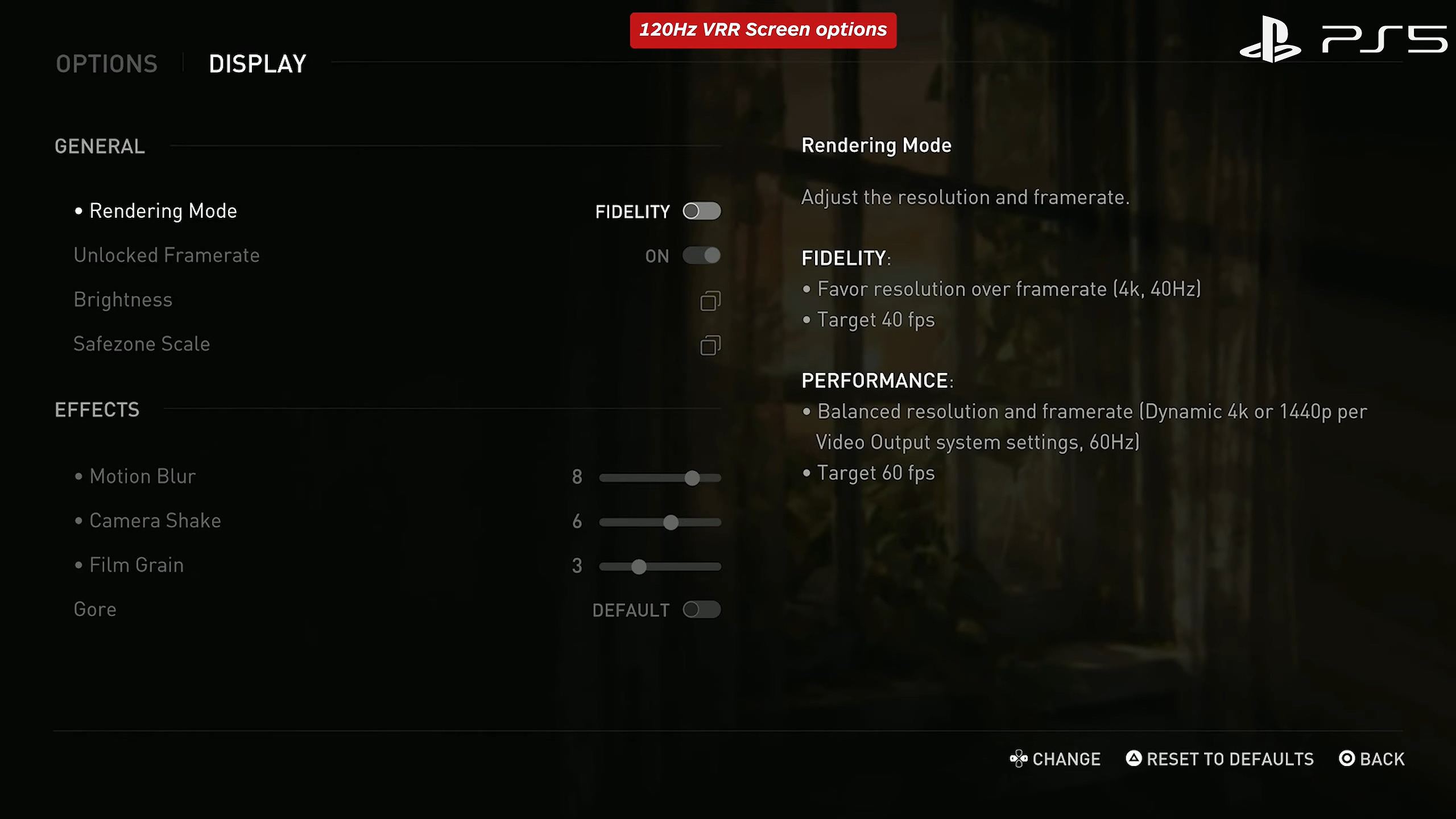 그래픽 모드는 「FIDELITY(충실도)」, 「PERFORMANCE(성능)」 2개의 모드를 제공하며, 충실도는 일반 모니터에선 4K/30FPS, 120Hz VRR 지원 모니터에선 4K/40FPS로 구동된다. 성능 모드는 모니터 해상도에 따라 동적4K/1440p, 60FPS로 작동된다.