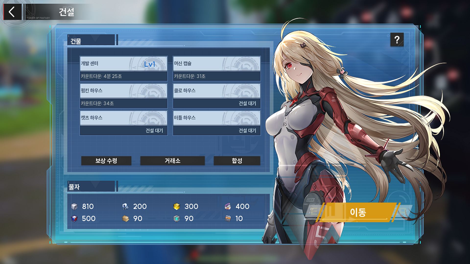 - 건설 - 개발 센터는 주민들의 삶을 위한 핵심 건물으로, 개발 센터를 레벨업하면 작업장의 최대 레벨을 올릴 수 있다. 각 작업장에는 상응하는 AI 서번트가 있으며, 작업장 레벨업 시 작업 가능한 AI 서번트의 수량이 증가하며, 물자 채집 효율을 높일 수 있다.