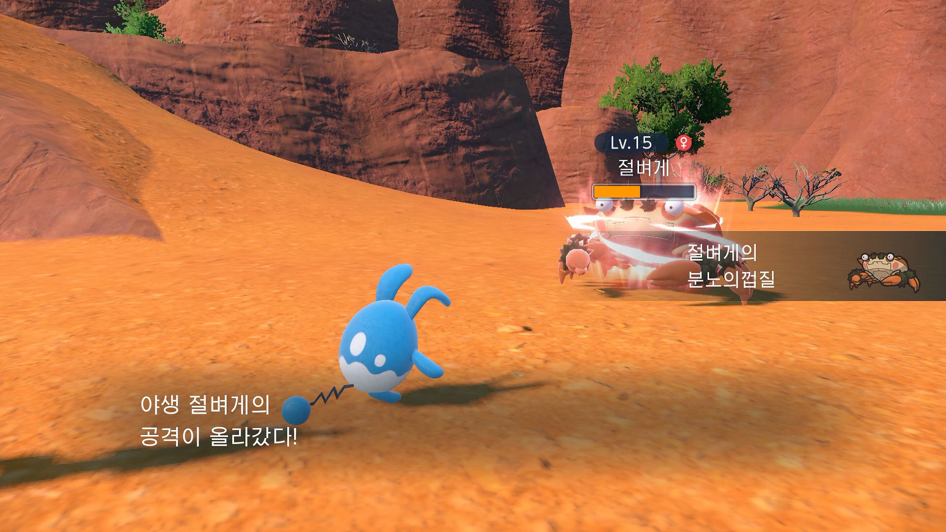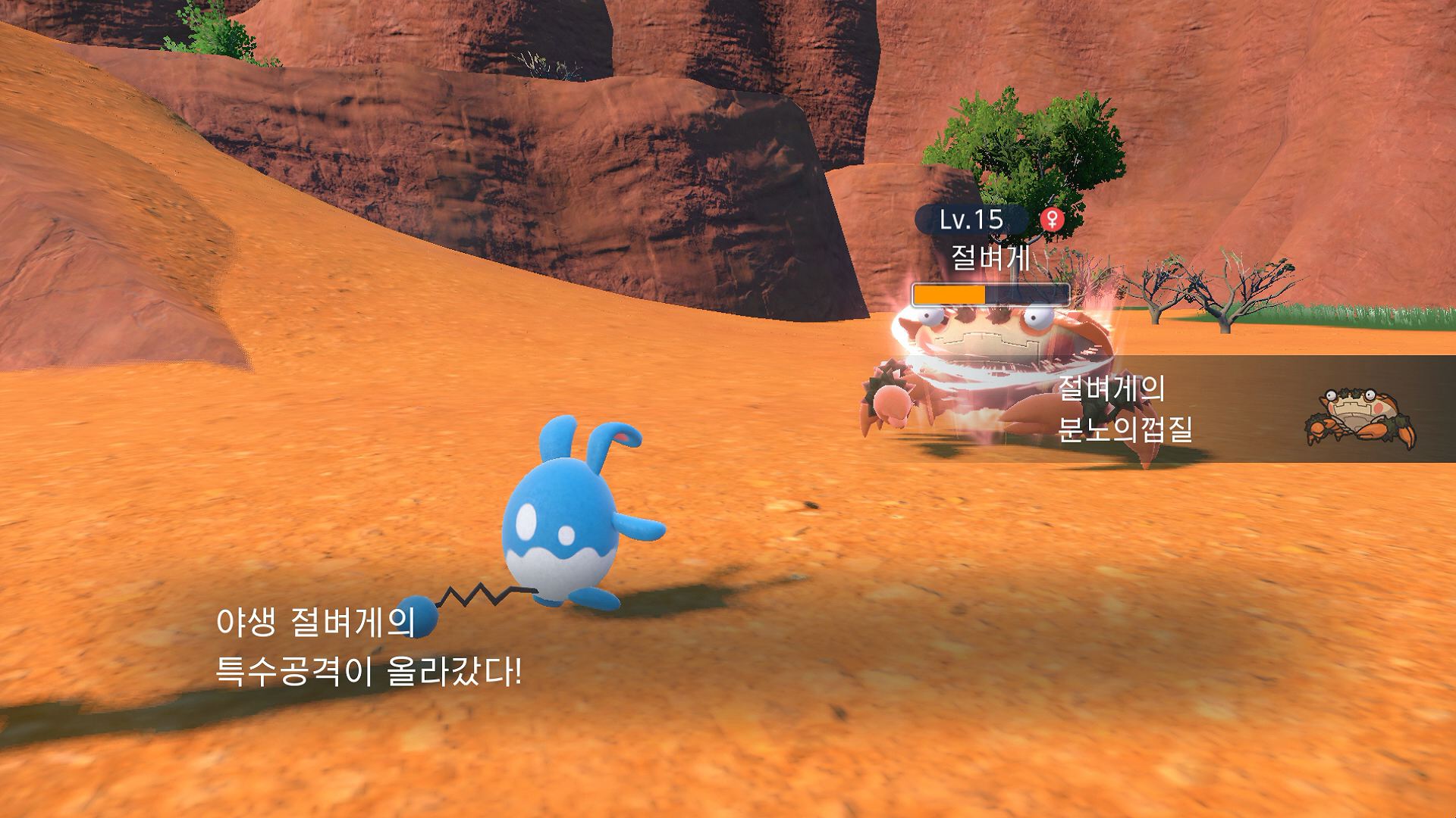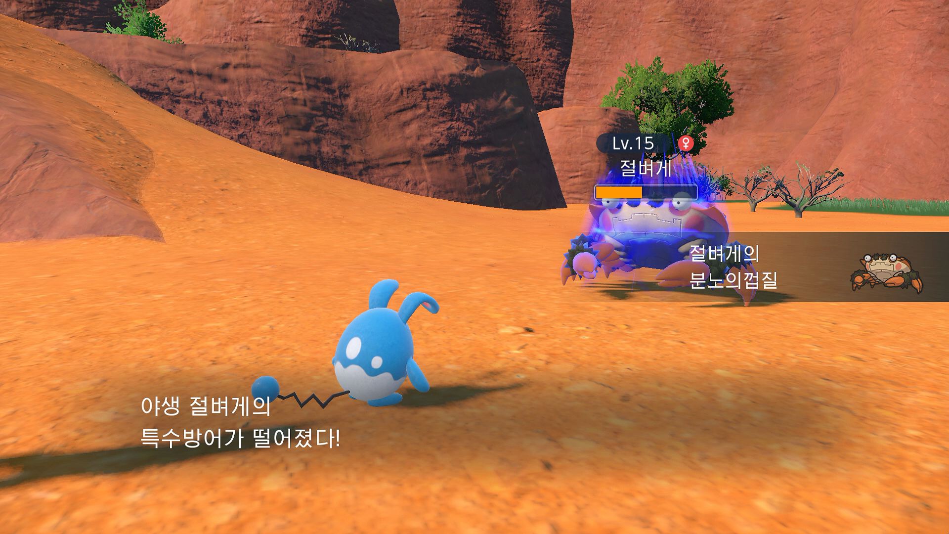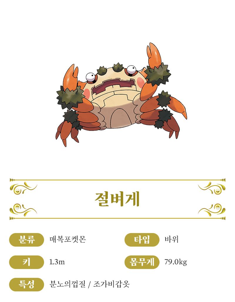 - 절벼게 - 절벼게는 튀어나와 있는 눈알을 요리조리 회전시켜서 사각 없이 볼 수 있습니다. 바로 위에서 사냥감을 덮칠 수 있게 거꾸로 절벽에 매달려 있습니다. 단, 머리에 피가 몰려서 어지럽기 때문에 오래 버티지는 못한다고 합니다. 절벼게의 집게는 집는 힘이 강해서 사냥감을 잡으면 놓치는 법이 거의 없습니다. 새로운 특성 「분노의껍질」은 절벼게의 HP가 절반이 되면 분노에 의해 '방어/특수방어'가 떨어지는 대신, '공격/특수공격/스피드'가 올라갑니다.
