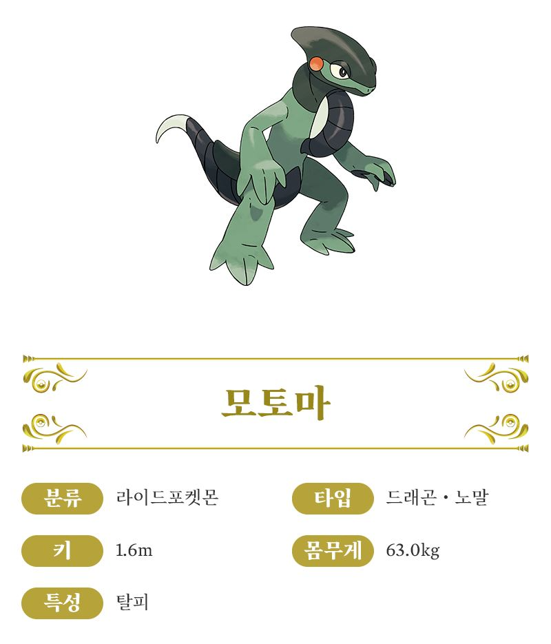- 모토마 - 옛날부터 팔데아 지방의 많은 가정에서 사람과 함께 생활하던 포켓몬입니다. 성질이 온순해서 사람들이 일상적으로 타고 다닙니다. 이를 싫어하지 않는 이유는 사람의 체온 덕분에 추위를 견딜 수 있기 때문입니다. 사람을 태웠을 때의 최고 속력은 120km/h 정도이며, 새로운 기술 「꼬리자르기」은 자신의 HP를 깎아서 대타가 되는 분신을 만든 다음, 교대 포켓몬과 교체합니다.