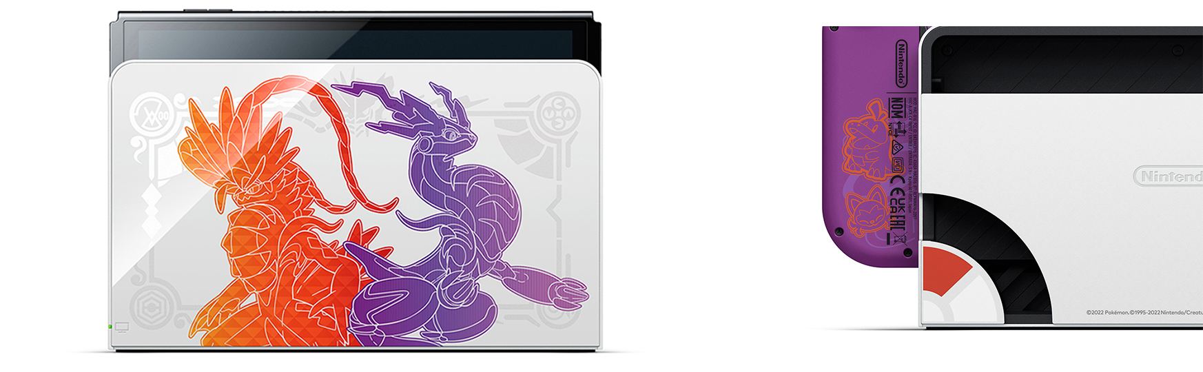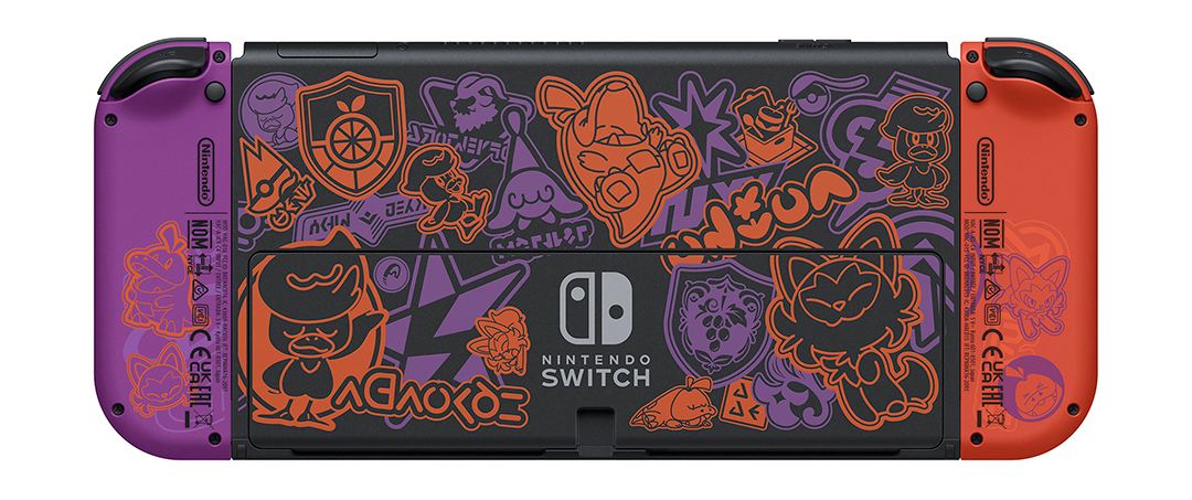 - 특별한 컬러의 Joy-Con - 『포켓몬스터스칼렛・바이올렛』의 메인 컬러에 맞춘 특별한 컬러의 Joy-Con에는 게임에 등장하는 오렌지 아카데미/그레이프 아카데미 각각의 문장이 디자인되어 있다.
