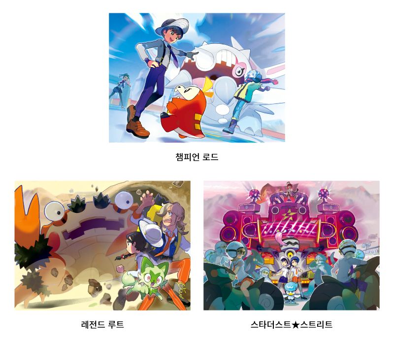 - 주인공이 다니는 학교에는 특별한 자율 학습 프로그램이 있습니다. 테마는 「보물찾기」로서 다음과 같이 자신만의 보물을 찾아 세계를 여행하게 됩니다. 웅대한 팔데아지방의 각지에 있는 체육관에 도전하며 챔피언 랭크를 목표로 하는 「챔피언 로드」, 페퍼와 함께 희귀한 식재료를 찾아 나서는 「레전드 루트」, 학교에서 문제시되고 있는 집단「스타단」에게 도전하는 「스타더스트★스트리트」라는 3개의 이야기가 펼쳐지게 됩니다.