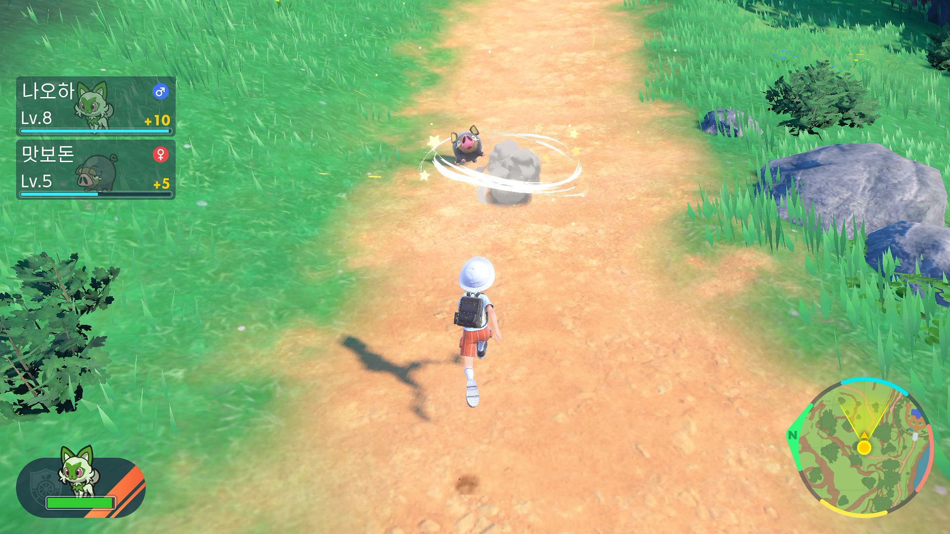 - '레츠고'란? - 팔데아지방의 필드에서는 1마리에 한해 포켓몬을 데리고 다닐 수 있습니다. 포켓몬을 데리고 다니는 상태로 필드를 모험 중일 때 「레츠고」를 사용하면 주인공이 가리킨 방향으로 포켓몬을 보낼 수 있습니다. 「레츠고」로 지시를 내린 포켓몬은 이동한 방향에 떨어져 있는 도구를 주울 수 있으며, 가까이에 있는 야생 포켓몬과 알아서 싸우는 「맡기기 배틀」을 할 수도 있습니다.