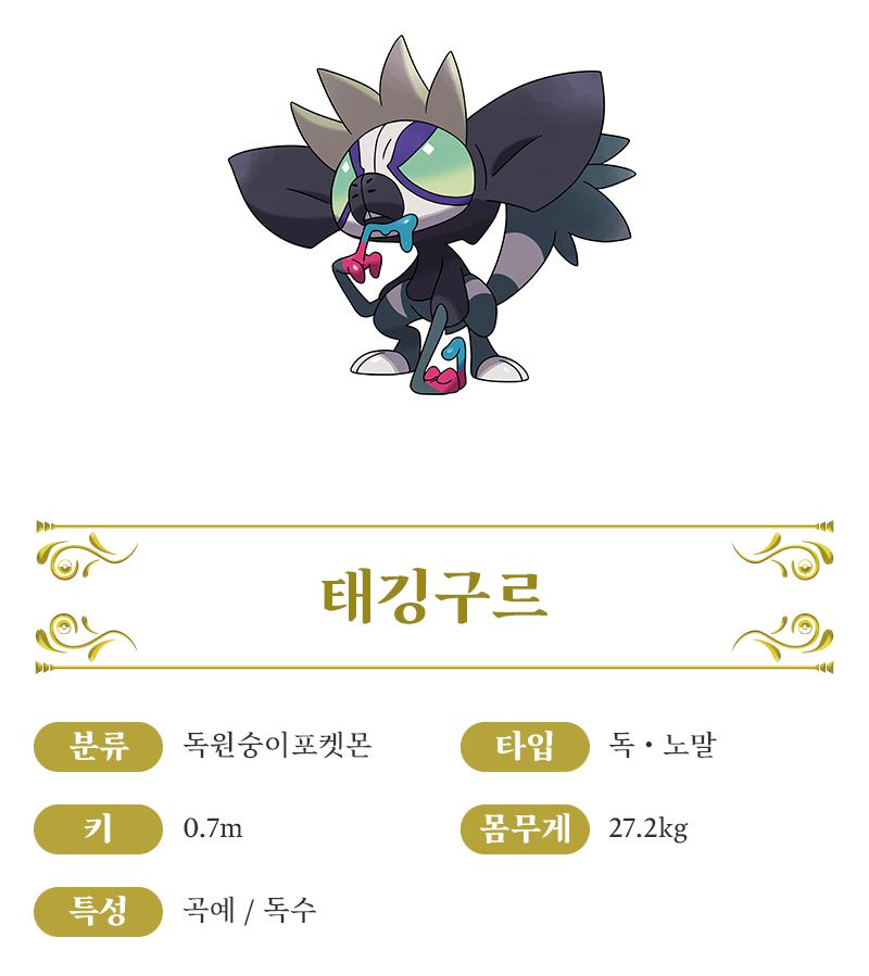 - 태깅구르 - 태깅구르의 독성을 띠는 침은 위험을 감지하면 더욱 강한 맹독으로 먹은 것에 따라 색이 변하는 독액을 입에서 분사하거나, 독액을 바른 예리한 손톱으로 베어 가르는 공격이 특기입니다. 위험을 감지하면 독의 농도가 급격하게 진해져서, 한번 들이마시면 3일간 움직일 수 없게 되는 맹독으로 변합니다. 야행성으로 해가 지면 손가락을 핥아서 독액을 묻힌 다음, 영역에 독으로 된 함정을 설치합니다. 그리고 동틀 무렵이 되면, 움직일 수 없게 된 포켓몬들을 잡습니다.