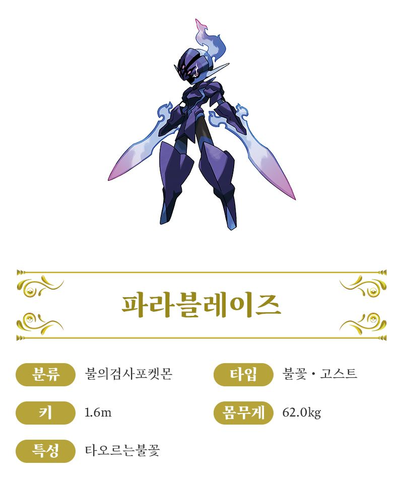 - 불꽃의 대검으로 생명 에너지를 흡수한다 - 파라블레이즈는 원념이 깃든 오래된 갑옷을 입고 있으며, 불꽃과 고스트의 에너지로 이루어진 검을 지니고 있습니다. 싸움이 시작되면 화력이 상승하여 대검으로 변합니다. 이 대검에 베이면 생명 에너지가 빠져나가는 상처를 입게 됩니다.