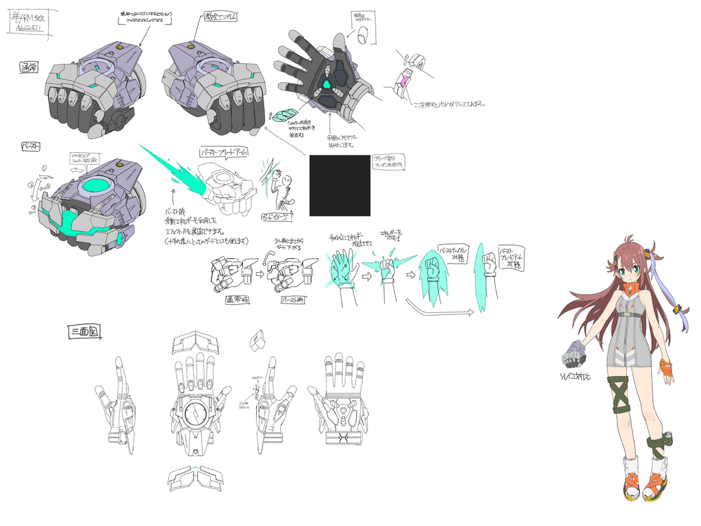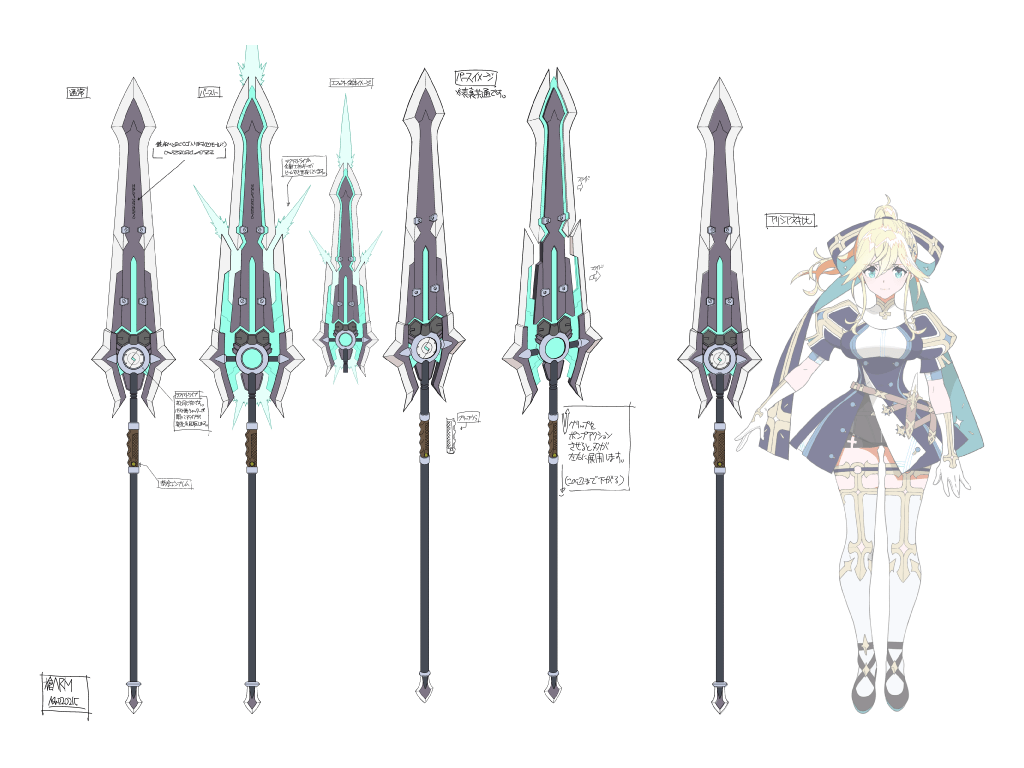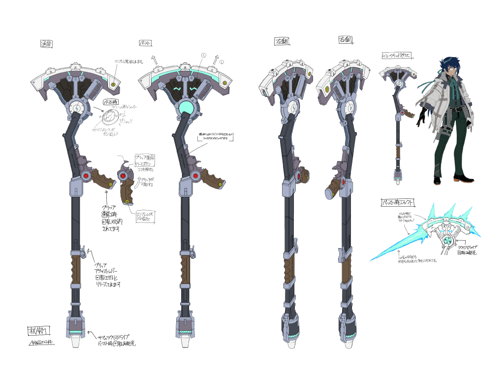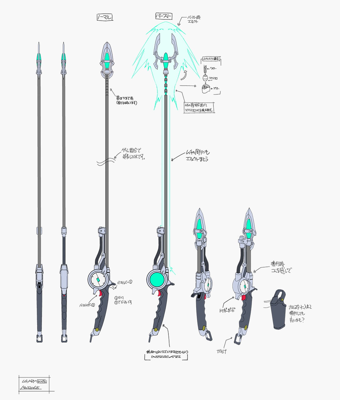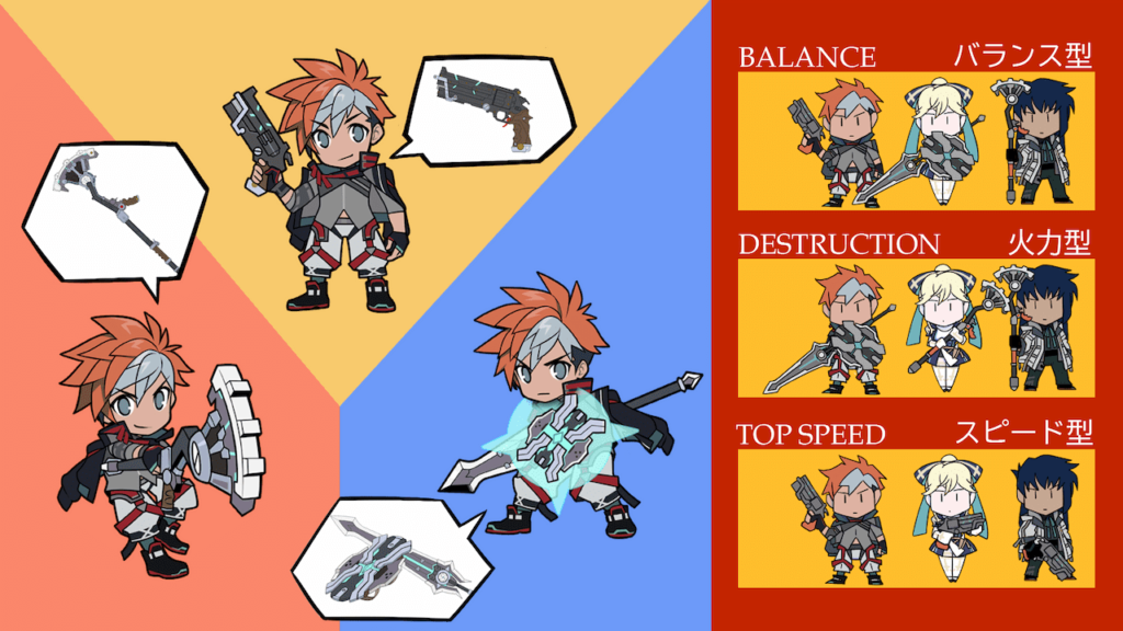 - 캐릭터들이 사용하는 ARM은 6개의 계통으로 나뉘어져 있는데, 각각의 계통에는 배틀 중의 롤(역할)이 설정되어 있으며, 장비 시 상승하는 파라미터나 사용할 수 있는 스킬의 경향이 크게 다르다. 「총」은 빠른 행동으로 다수의 적을 상대로 처신하는 역할, 「창」은 높은 공격력과 견고한 방어력으로 물리 전을 담당하는 역할, 「지팡이」는 마력에 의한 속성 공격으로 마법전을 담당하는 역할과 같은 방식인 것.