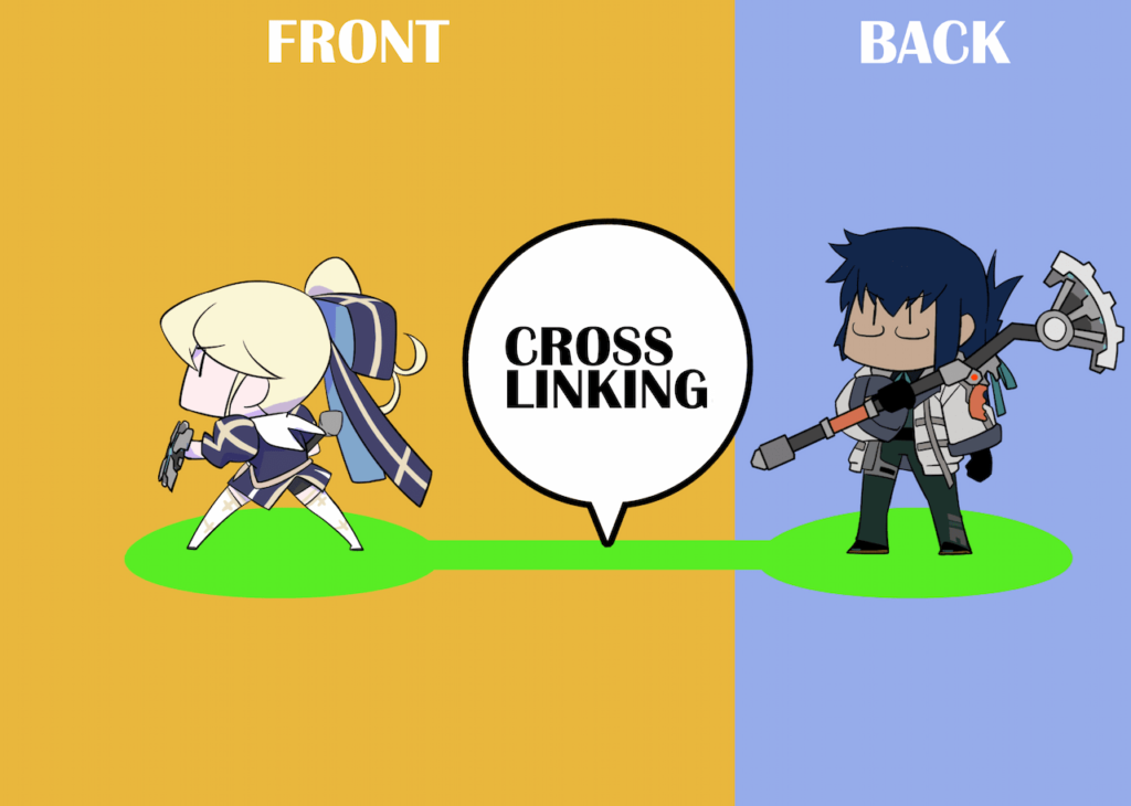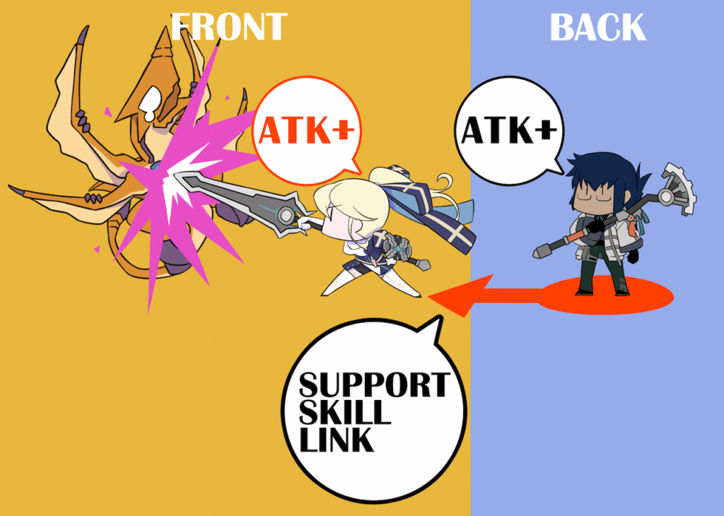 - 3. 서포트 스킬 공유 - 크로스 링키지된 파티원들은 서로의 서포트 스킬을 공유한다. 즉 후방의 캐릭터가 '공격력 상승'을 가지고 있으면 전방의 캐릭터도 같은 스킬 효과를 얻을 수 있는 것.