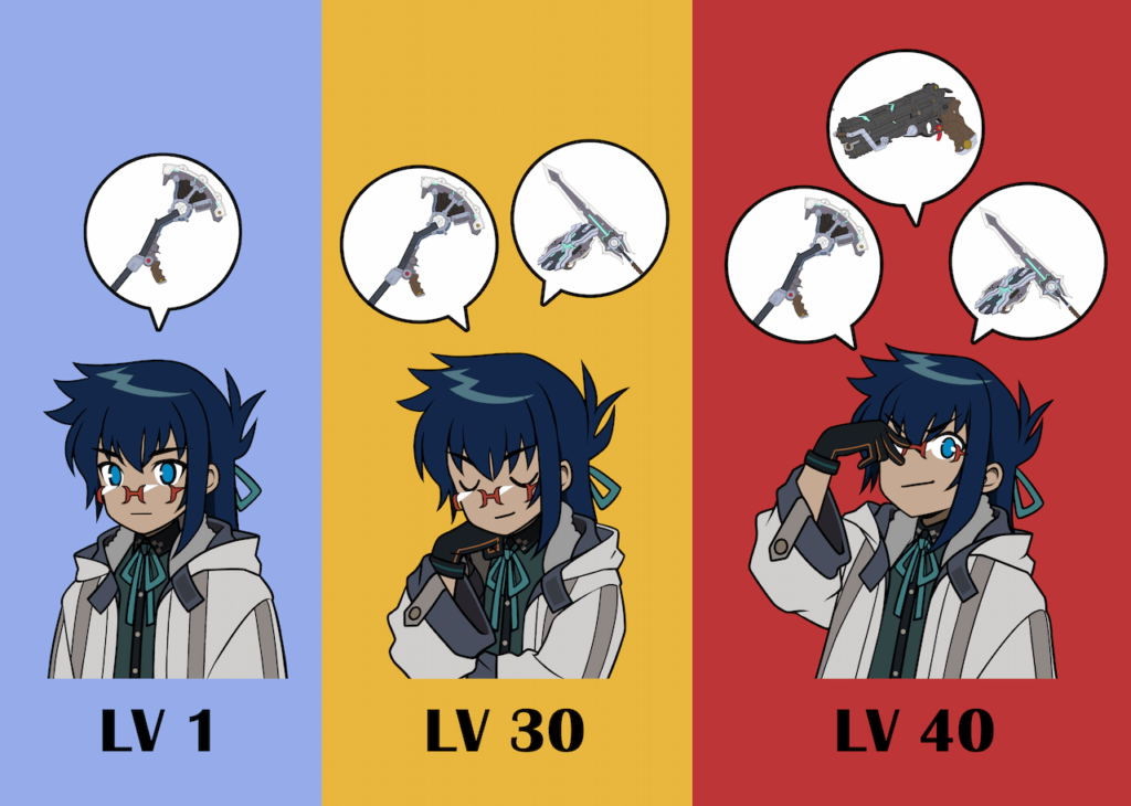 - 초기 상태에서는 ARM 하나로 시작하지만, 레벨이 30이 되면 하나 늘릴 수 있고, 이후 레벨이 10 올라갈 때마다 장비 가능한 ARM 계통이 하나씩 늘어난다. 캐릭터의 장비 가능 ARM을 어떤 순서로 습득시켜 나갈지는 플레이어 나름.