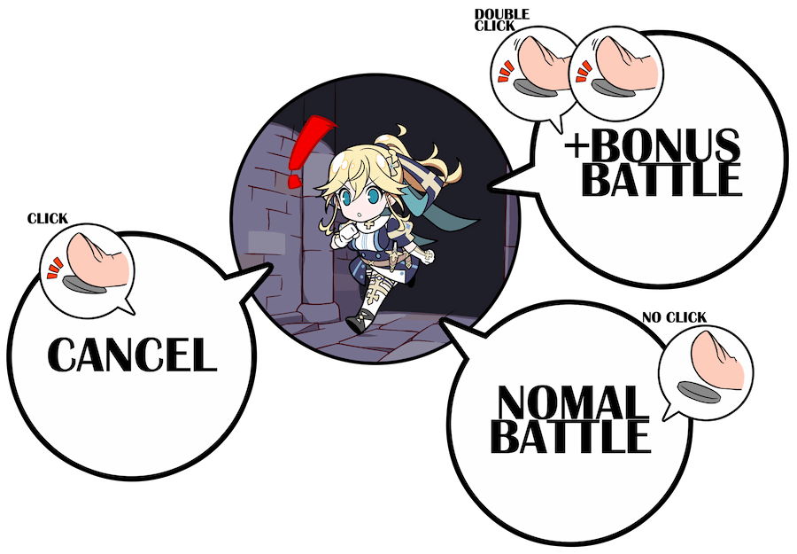 - ON/OFF 가능한 인카운터 시스템 - 전투는 적과 만나면 화면이 전환되어 진행되는 인카운터 배틀 시스템 방식. 하지만 적과 인카운터 했을 때 캔슬 버튼을 누르면 언제든지 적과 배틀을 취소할 수 있어 스트레스 없는 게임 진행이 가능하다.