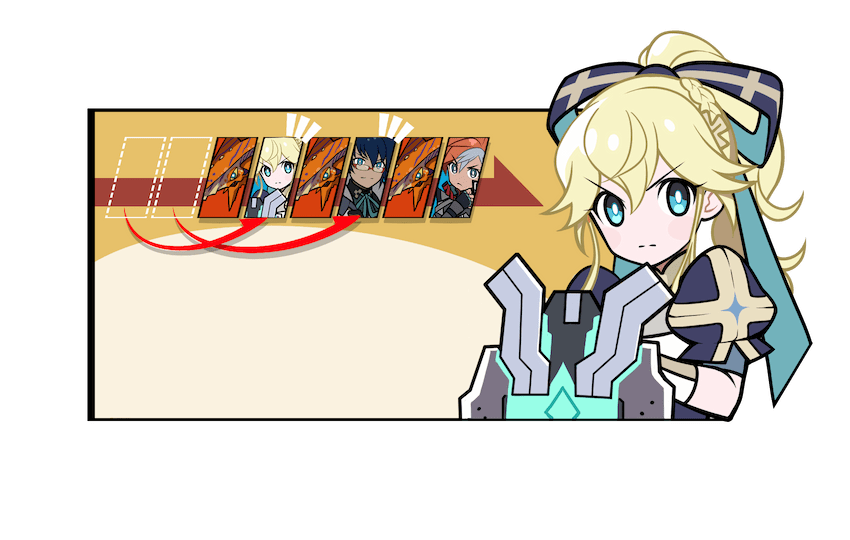 - 1. 전방과 후방의 교환 - 커맨드 선택을 통해 전방/후방 인원을 교체할 수 있고 후방에 위치한 아군은 턴 경과로 HP가 회복되기 때문에 위기 상황에 사용하면 좋다.