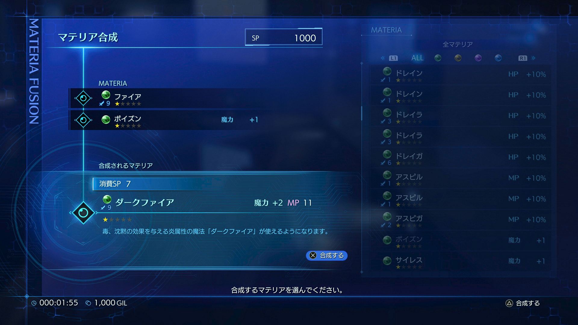 - 마테리아 합성 - 두 종류의 마테리아를 합성하여 새로운 마테리아를 만들 수 있다. 합성에는 적을 쓰러뜨리는 것 등으로 입수할 수 있는 「SP」를 소비한다. 또한 합성에 사용한 마테리아는 사라져 버리지만, 초기 단계에서 강력한 마테리아들을 만들어 낼 수 있거나, 일반적으로는 구할 수 없는 마테리아를 얻기도 한다. '파이어'와 '포이즌'을 합성하면 '다크 파이어'를 만들 수 있고, 다크 파이어는 화염 속성의 마법 공격에 더해 독+침묵 효과가 있다.