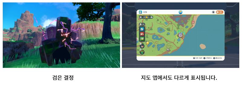 - 팔데아지방에서 모험하다 보면, 보통의 테라 레이드배틀 결정과 다른, 특별한 모습의 검은 결정을 발견할 수 있습니다. 검은 결정 테라 레이드배틀에서는 보다 강력한 포켓몬이 등장하며, 쓰러뜨리는 데 성공하면 호화로운 보상을 받을 수 있습니다.