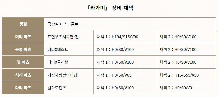 카카미의 캐릭터 편집 레시피와 장비 채색 옵션