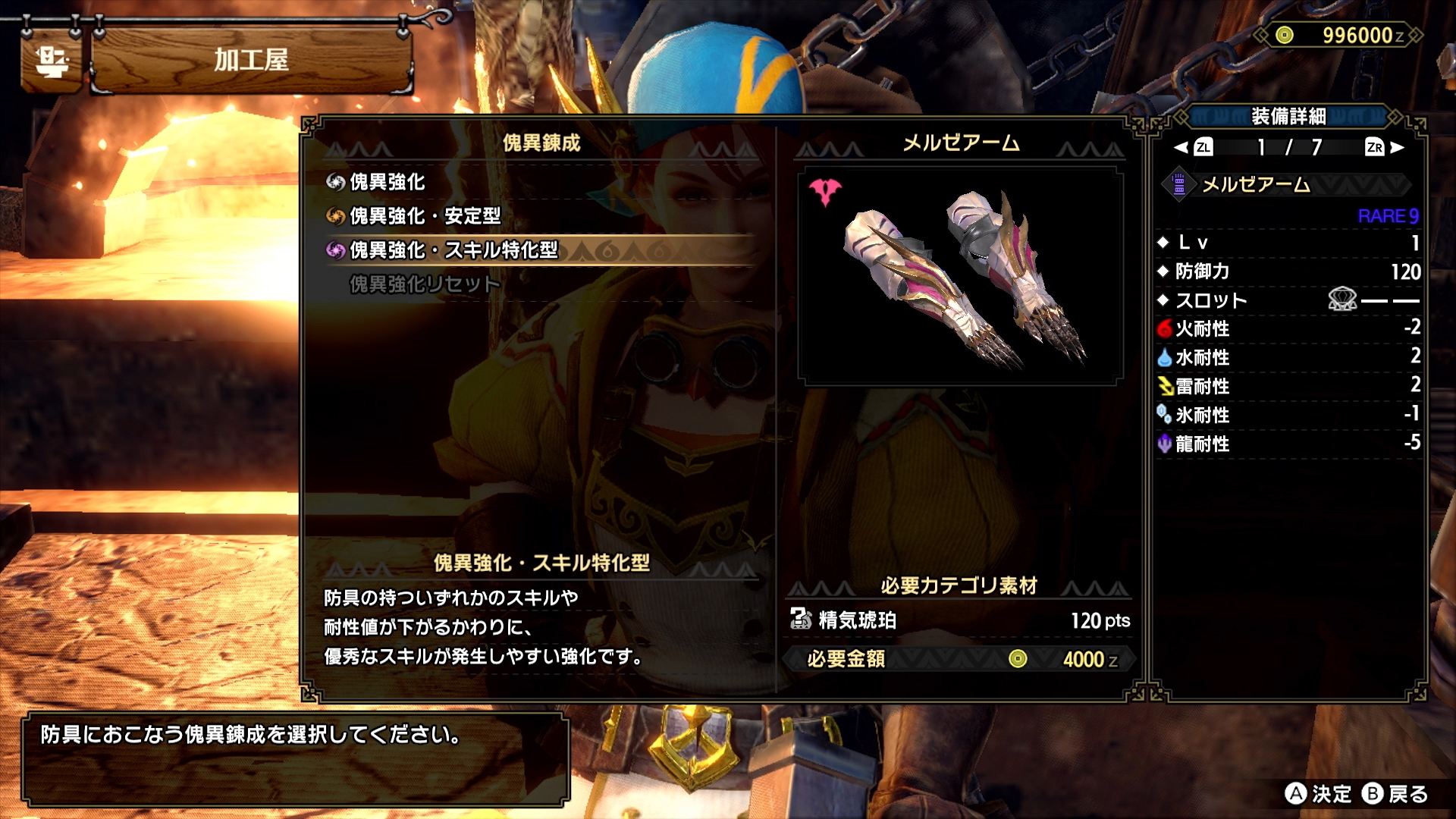 - 괴이강화·스킬 특화형 - 방어구가 가진 어느 하나의 스킬 및 내성치가 감소하는 대신 우수한 스킬이 발생하기 쉬운 강화.