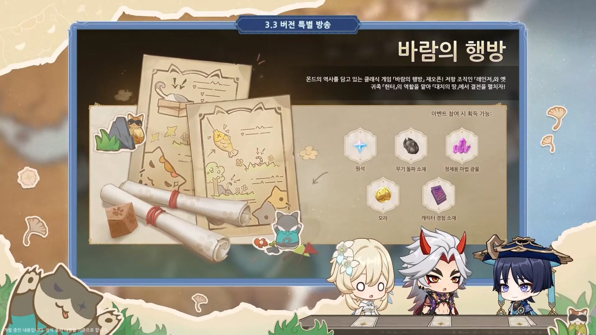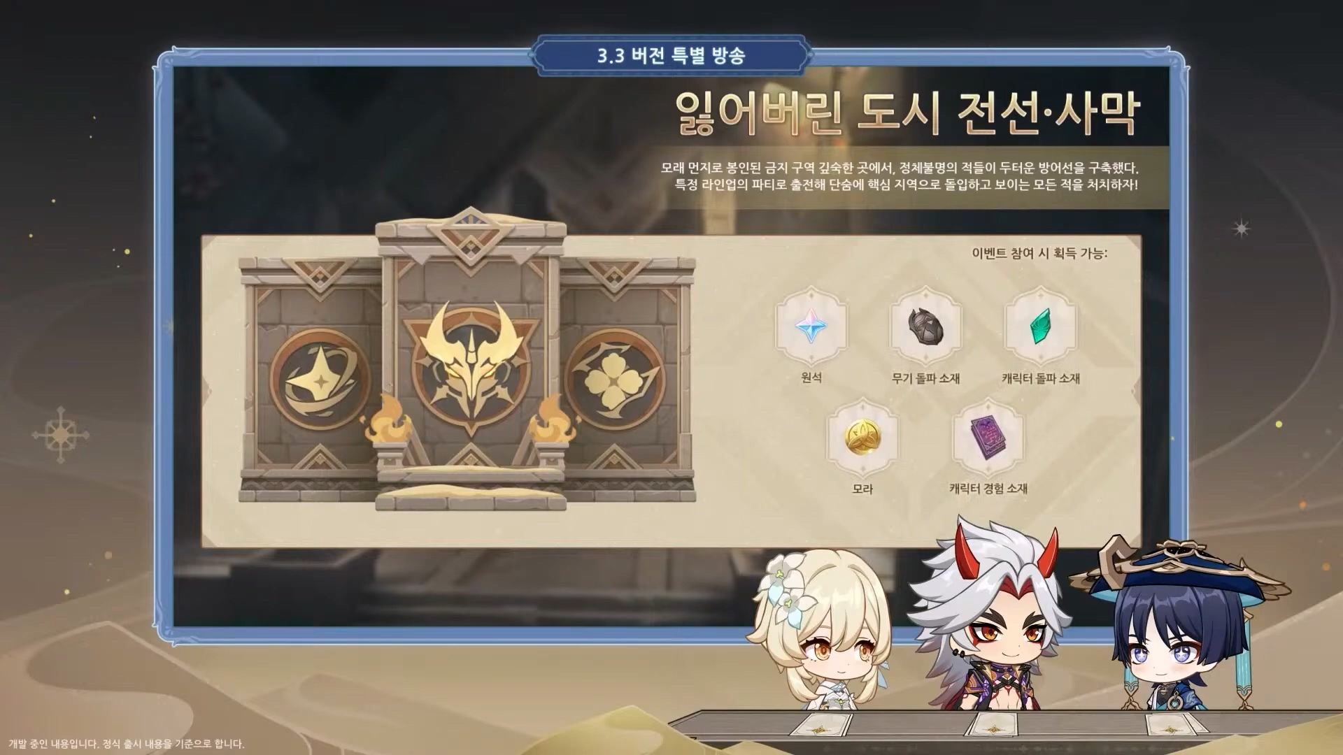 또한 3.3 버전에서 지맥의 격류 이벤트가 다시 열린다. 적은 레진으로 캐릭터 경험치 책과 모라를 많이 얻을 수 있으니, 키울 캐릭터가 많은 유저들이나 혹은 앞으로를 대비해 얻어 놓자!