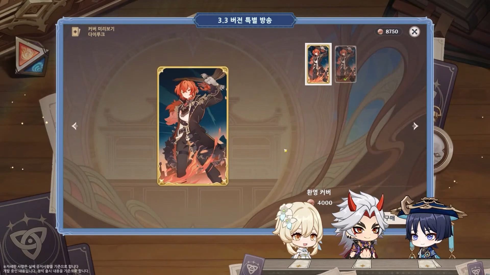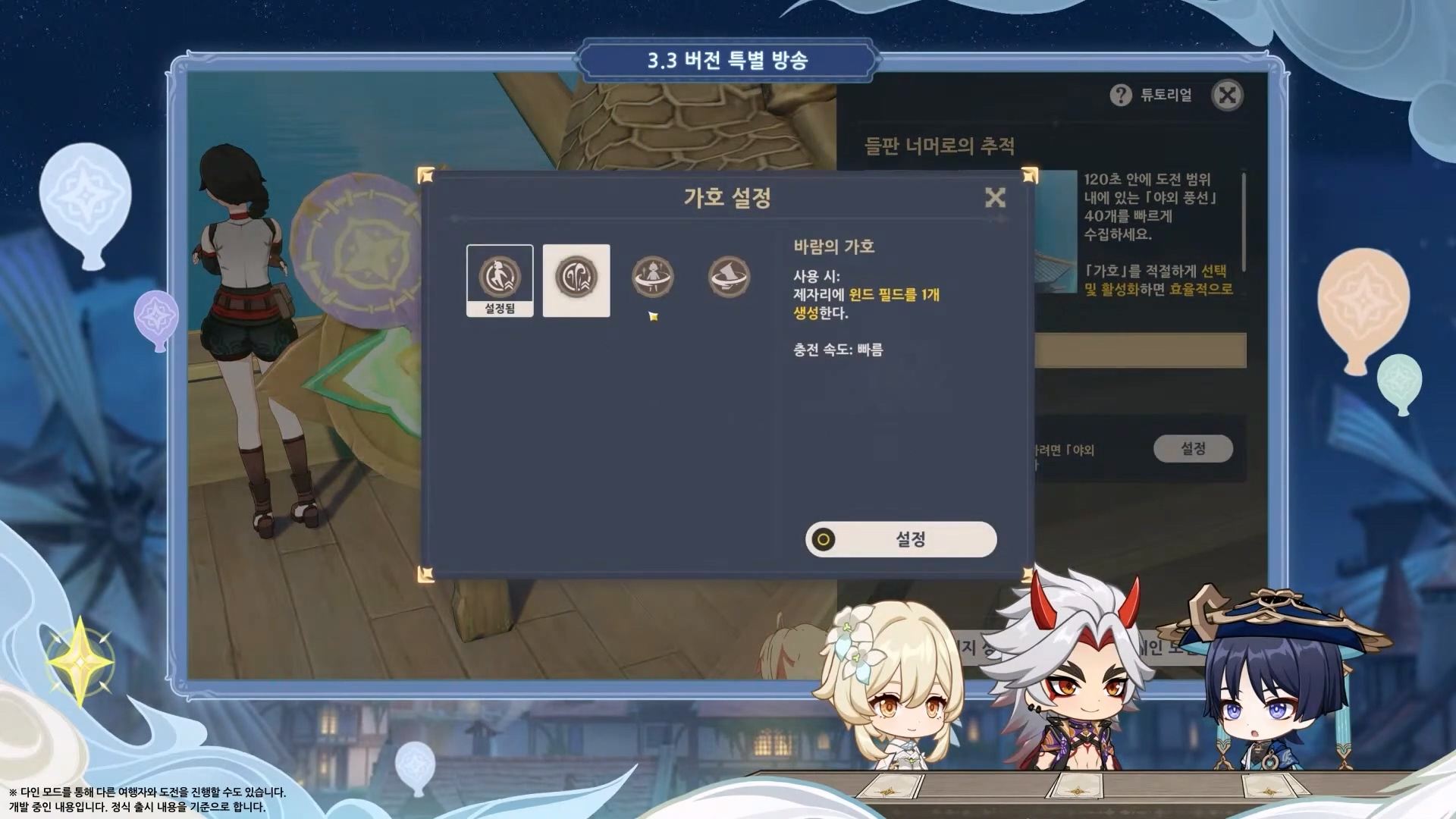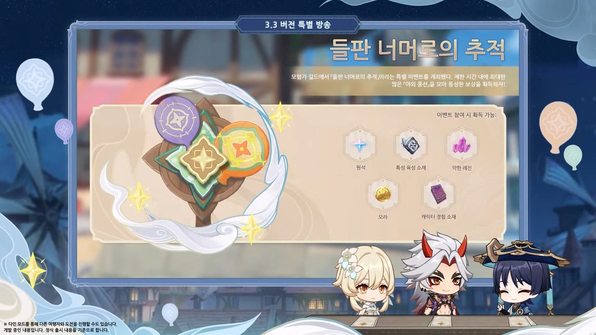 - 이번 3.3 버전에서는 우인단 집행관 중에 한 명이었던 스카라무슈가 「방랑자」라는 이름으로 새롭게 등장하고, 수수께끼의 학자 「파루잔」과 함께 기원 이벤트에 참여한다. 긴 수명을 가진 두 명의 새로운 캐릭터는 우여곡절의 인생을 겪은 뒤 여행자의 동료가 된다고 한다. 또 티바트에서 유행하는 새로운 카드 게임 「일곱 성인의 소환」을 비롯해 담력시험/숨박꼭질/풍선찾기 등의 다양한 이벤트가 제공될 예정.