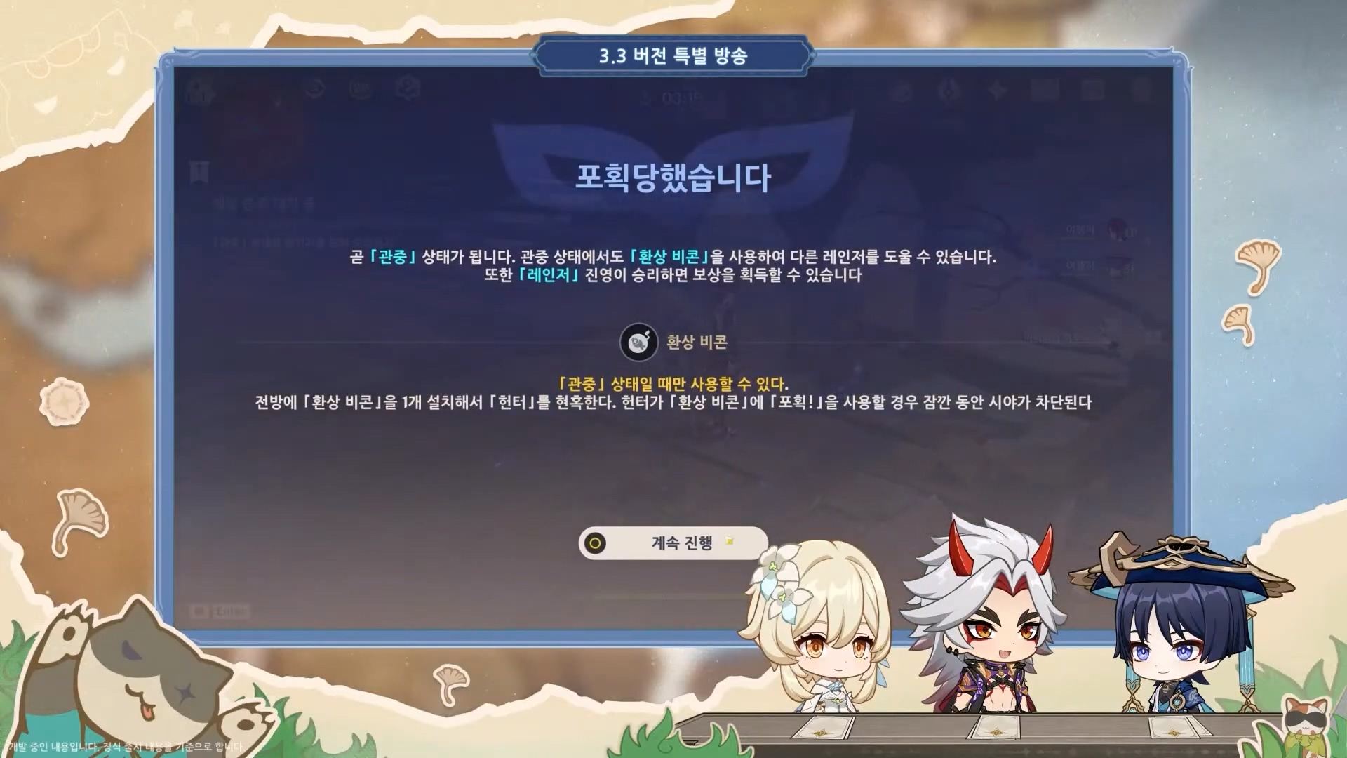 - 다인 모드 콘텐츠인 숨바꼭질 이벤트가 돌아왔다. 플레이어는 헌터/레인저 역할의 맡게 되고 헌터는 모든 레인저를 찾고 레인저는 헌터를 방해하고 숨는 것이 목표다. 이번에는 레인저가 헌터에게 잡혀도 관중 상태가 되어 「환상 비콘」을 사용해 다른 레인저를 도울 수 있다고 하며, 뿐만 아니라 헌터의 새로운 스킬들이 등장, 스킬 「투망」은 범위 내에 레인저의 위장을 해제하고 힌트를 얻을 수 있다.
