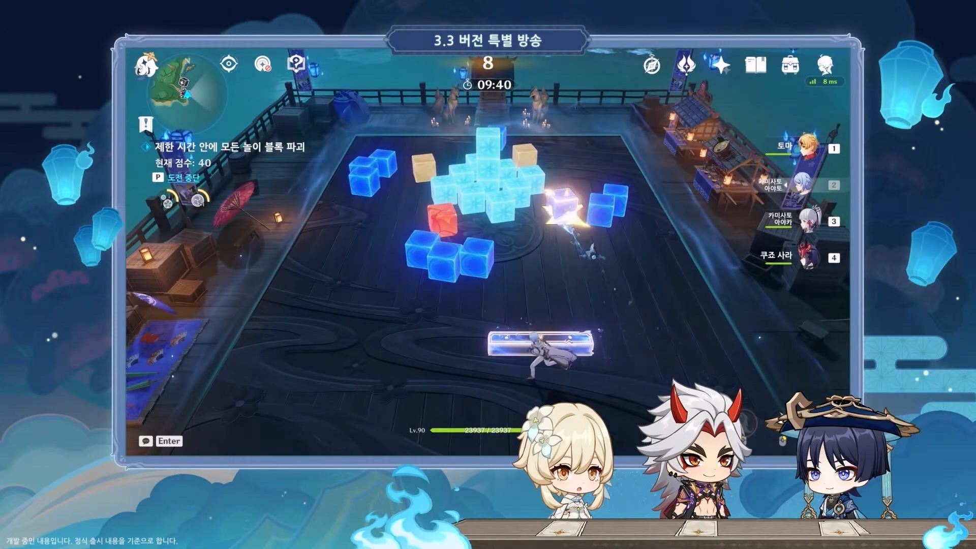 - 최신 소식에 빠삭한 페이몬이 야시로 봉행에서 주최하는 새로운 이벤트 「담력 시험」에 대한 정보를 입수했다. 패드를 조작해 술법 공을 튕겨내서 더 많은 블록 부시는 미니 게임으로, 각 캐릭터의 원소 반응도 적용 가능하고 놀이 전략 버프를 적용하면 더욱 수월하게 클리어할 수 있다. 다양한 원소 캐릭터와 놀이 전략을 조합해보자. 보상으로 「★4 한손검 꽃잎비」 등 획득 가능.