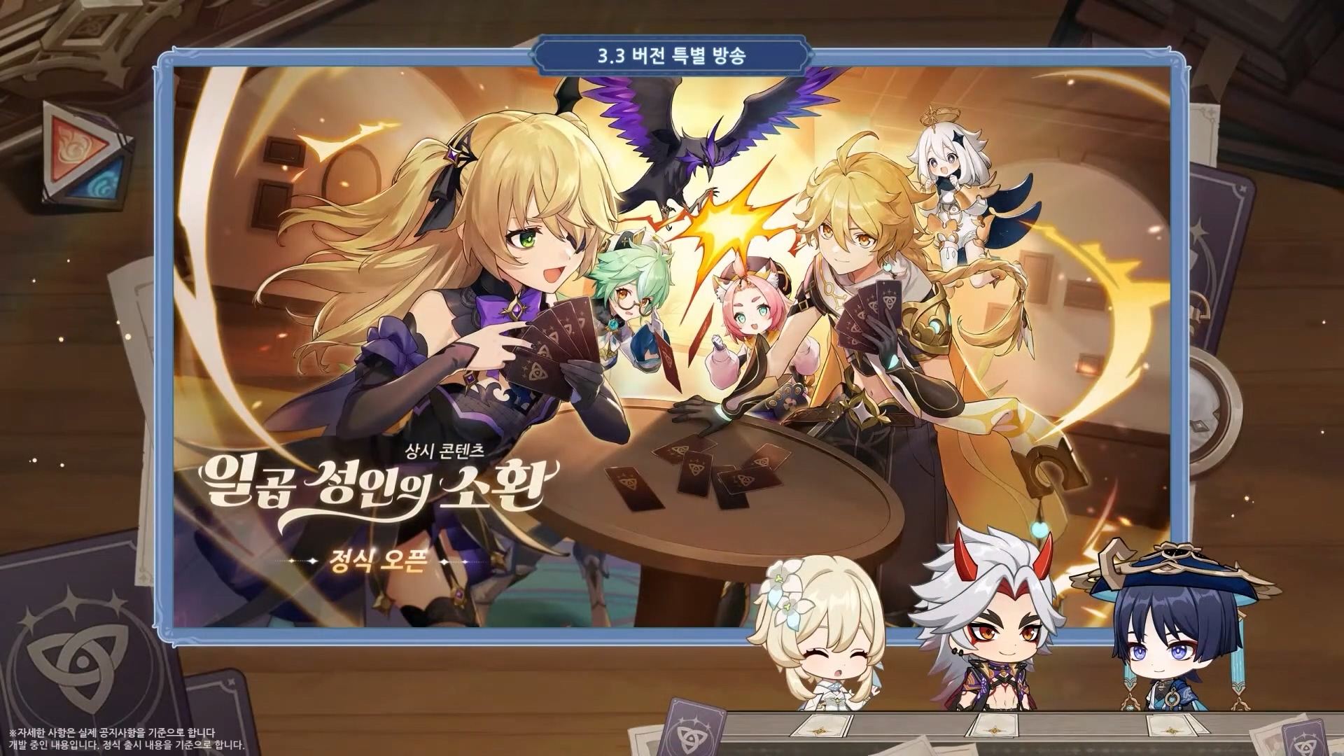 - 신규 카드 게임 - 이번 3.3 버전에서는 새로운 상시 콘텐츠로서 「일곱 성인의 소환」이 정식 오픈한다. 여러 캐릭터와 NPC, 친구와 함께 플레이할 수 있는 카드 게임으로, 룰은 간단하며 자신의 덱을 구축하고 상대의 모든 캐릭터 카드를 쓰러트리는 것이 목표다. 실력에 자신 있는 유저는 다른 유저를 초대해서 대결을 할 수 있고 플레이어 레벨을 올려 매칭 대전도 가능해진다.