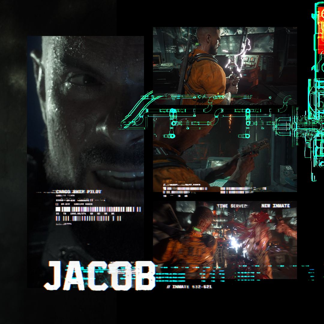 - 제이콥 리 - 이번 작품의 주인공. 의문의 화물을 싣고 칼리스토에 불시착한다. 이후 블랙 아이언 교도소에 수감되고 바이오페이즈의 공포와 맞닥뜨리게 된다. 제이콥은 전투 경험이 거의 없으며 위험한 존재들로부터 생존하기 위해 최선을 다해야 할 것이다. 참고로 성경에서 제이콥은 아이작(데드 스페이스의 주인공 이름)의 아들이라고 한다.