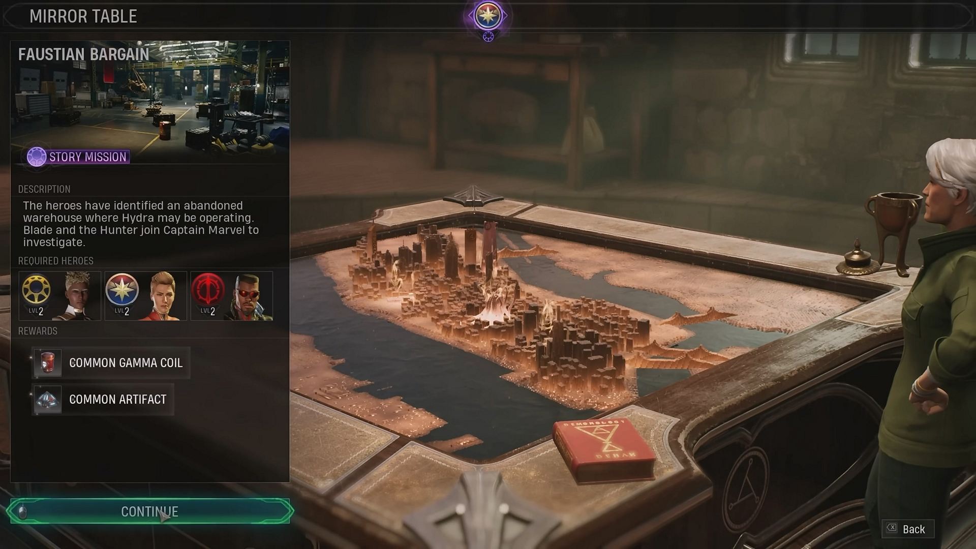 - 미션 선택, 작전실 - 현재 플레이 가능한 모든 임무는 거울 탁자의 전략적 전투 지도상에 표시되며, 각 임무의 요구 조건과 감마 코일을 비롯해 각종 보상, 난이도를 볼 수 있다. 또 작전실을 업그레이드하여 '실드'로부터 자원을 획득하거나 '스트라이크 터미널'에서는 제압한 적에게 영웅이 심문도 할 수 있게 된다.