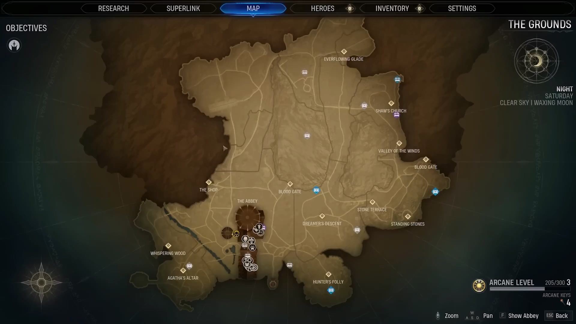 - 탐색 필드, 수도원 주변 - 수도원 밖의 숲과 평야, 언덕에는 발견되지 않는 힘과 수수께끼, 헌터의 과거에 대한 단서 등 많은 것들이 숨겨져 있으며 제작에 필요한 자원과 아이템을 수집할 수 있다. 또 「안식처」라는 장소에서는 다른 팀원을 초대해 보조 활동을 즐기거나, 선물을 주거나, 알맞은 대화문을 선택해하면 우정 보상을 두 배로 획득한다. 단, 각 안식처는 스토리 캠페인 중 한 번만 사용 가능하다.
