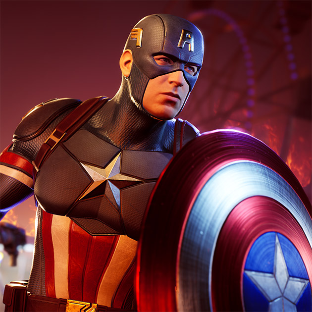 - 캡틴 아메리카 (스티브 로저스, 특기: 방어/공격) - 2차 세계 대전이 발발했을 때, 스티브 로저스는 왜소한 체구 때문에 군에서 거부당했지만 전쟁 막바지에는 강력한 슈퍼히어로이자 베테랑, 캡틴 아메리카가 되었다. 캡틴 아메리카는 아군의 피해를 흡수하며, 도발하고 방어를 생성해 자신의 체력을 유지한다.