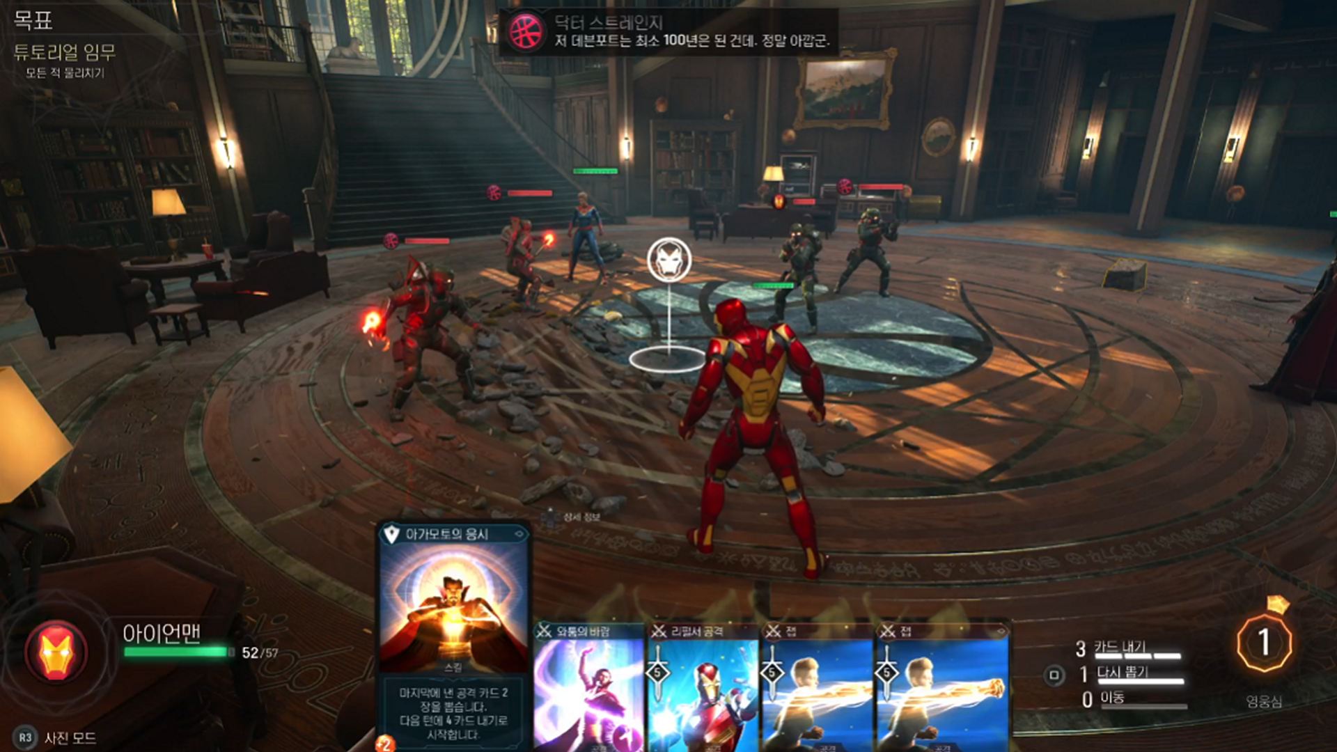 닥터 스트레인지로 단숨에 자원을 보급해 캡틴 마블 등의 폭발적인 파워를 개방하는 것도 유용. 높은 코스트의 카드로 고화력을 노리거나, 낮은 코스트의 카드로 고속전의 피해 + 약화를 노리는 플레이 등 게임 중에 독특한 카드 많이 입수되니 자신이 좋아하는 영웅과 전술을 조합해 보자.