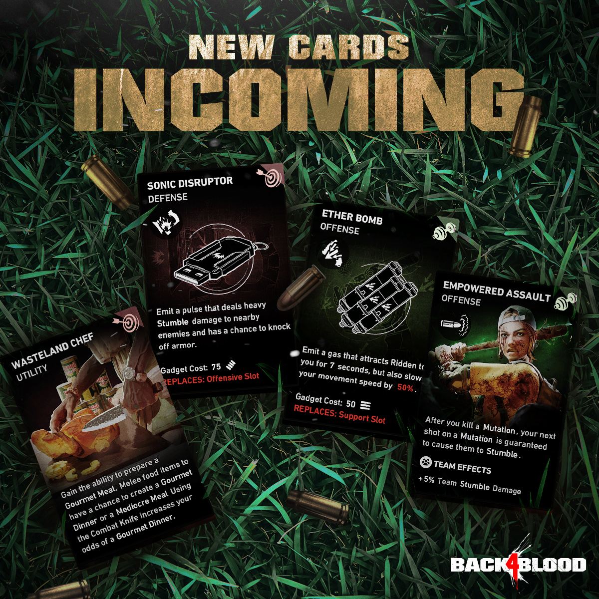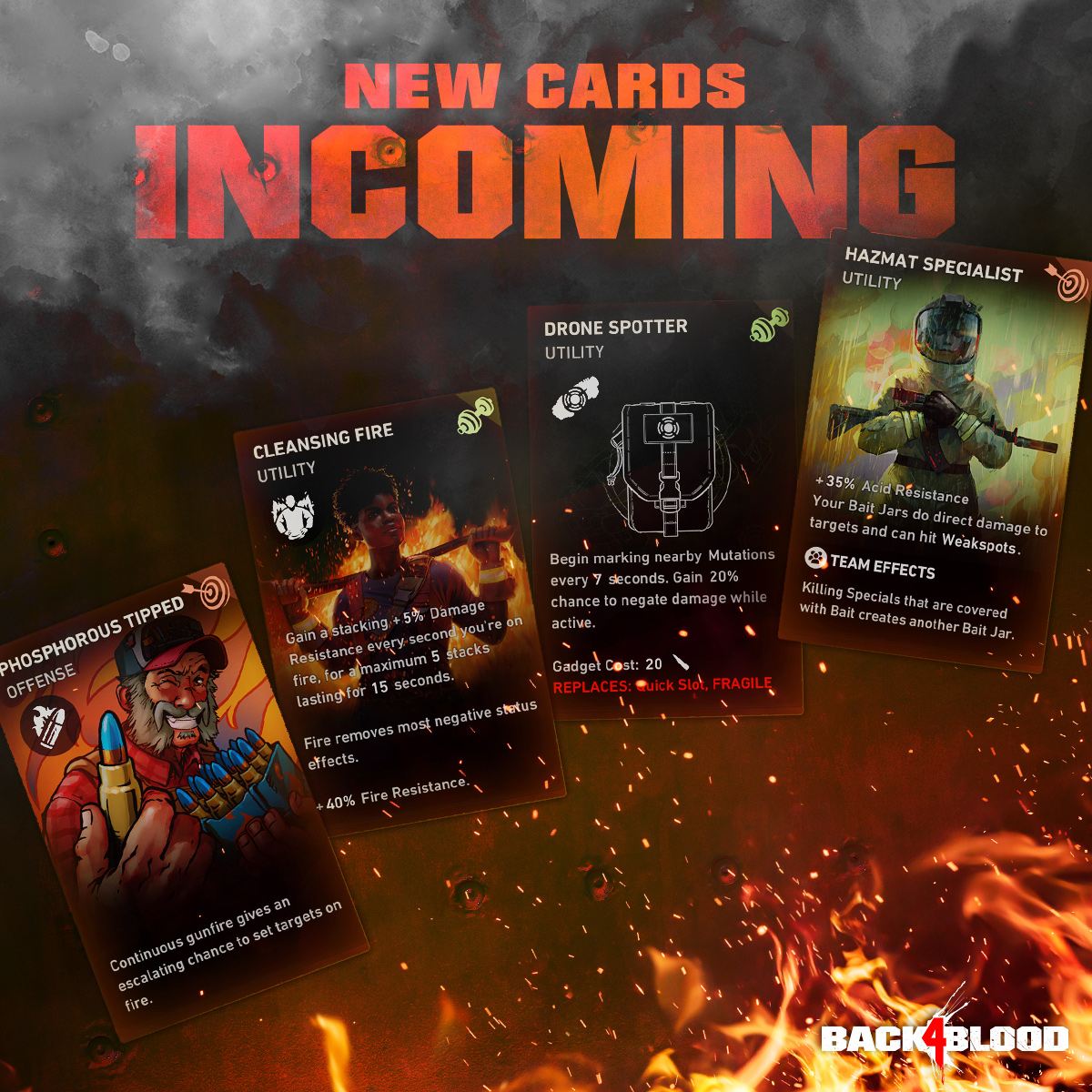 - 백4 블러드에서는 원래 원거리 무기의 부착물밖에 없었지만 이번 업데이트로 '택틱컬 그립', '마테리얼 키트', '핸드가드 스파이크' 등 새로운 근접 무기 부착물도 추가된다. 신규 무기로는 'LAW 로켓 발사기'와 '화염 방사기' 2개가 추가되며 화염 방사기는 가스 캔이나 프로판 가스에서 충전 가능. 또 호루라기를 통해 우호적인 톨보이 제프를 소환하여 전투에서 함께 싸울 수 있다.
