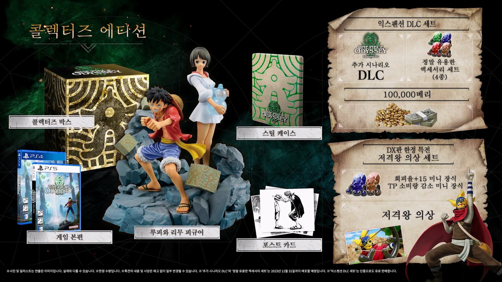 | 콜렉터즈 에디션 | 게임 본편 콜렉터즈 박스, 스틸 케이스, 루피와 리무 피규어, 포스트카드 디지털 디럭스 콘텐츠(익스팬션 DLC 세트, 저격왕 의상 세트) |