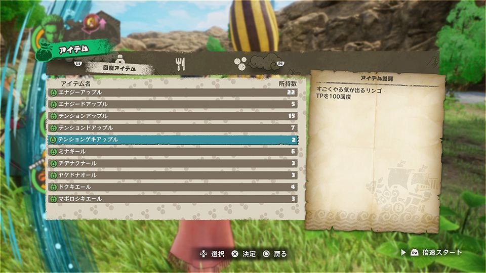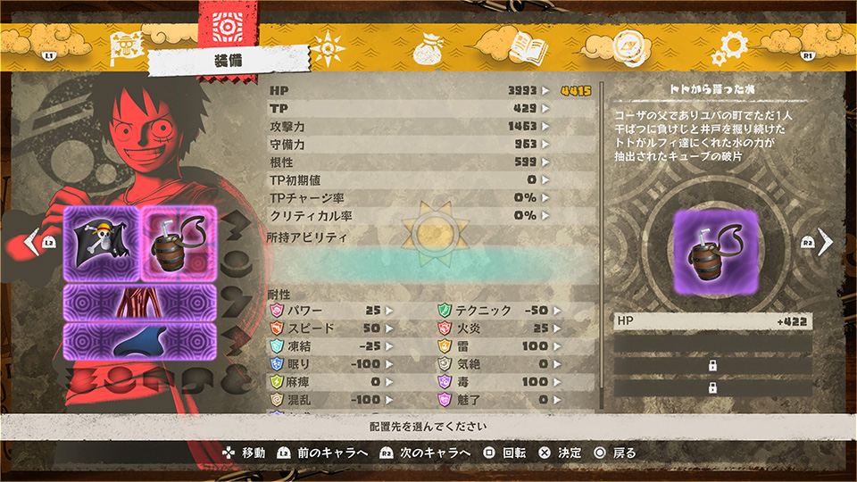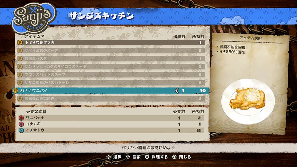 - 상디의 주방 - 상디의 필드 액션은 손에 들어오는 재료를 통해 캠프 중에 요리가 가능. 통상 아이템보다 효과가 좋기 때문에 많은 요리를 만들어 보스에 도전하자.