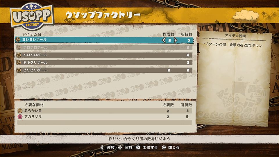 - 우솝의 팩토리 - 우솝의 필드액션은 손에 들어오는 소재를 캠프 중에 가공하는 것으로 「카타쿠리 옥」을 제작 가능. 전투 중에 높은 디버프 효과를 줄 수 있다.