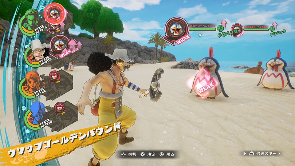 - 스킬 & 아이템 - 밀짚모자 일당의 친숙한 필살기로서 TP(텐션 포인트)를 소비하면 단체 or 다수의 적에게 공격 가능. 또 원거리 속성의 공격은 에리어를 넘는 공격이 가능하다. 아이템은 필드나 상점에서 얻을 수 있고 HP/TP의 회복, 상태 이상의 회복 등 다양한 대처가 가능해진다.