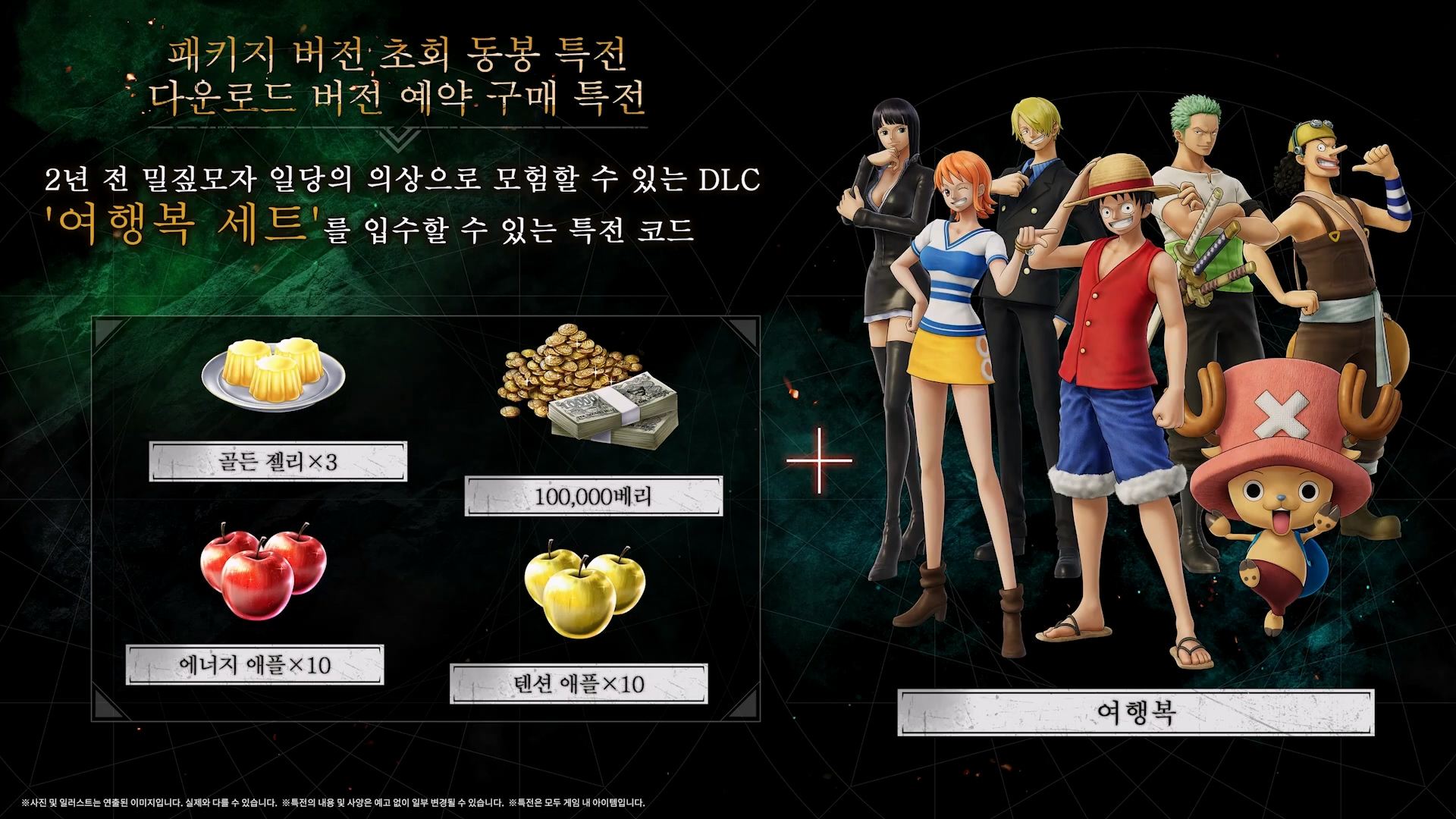 100,000 베리 에너지 애플 x10, 텐션 애플 x10, 골든 젤리 x3 여행복 세트(루피, 조로, 상디, 우솝, 나미, 쵸파, 로빈) |