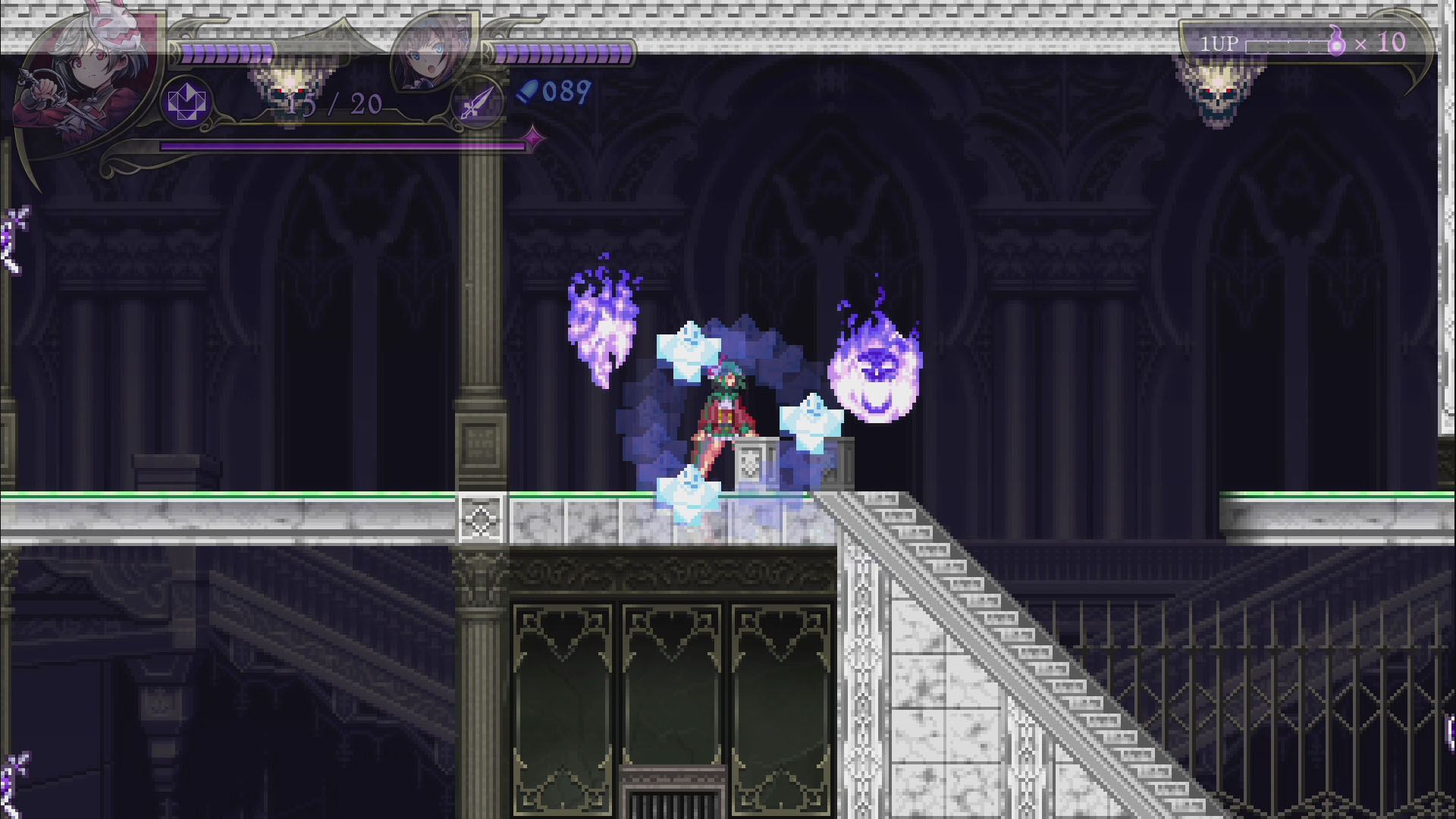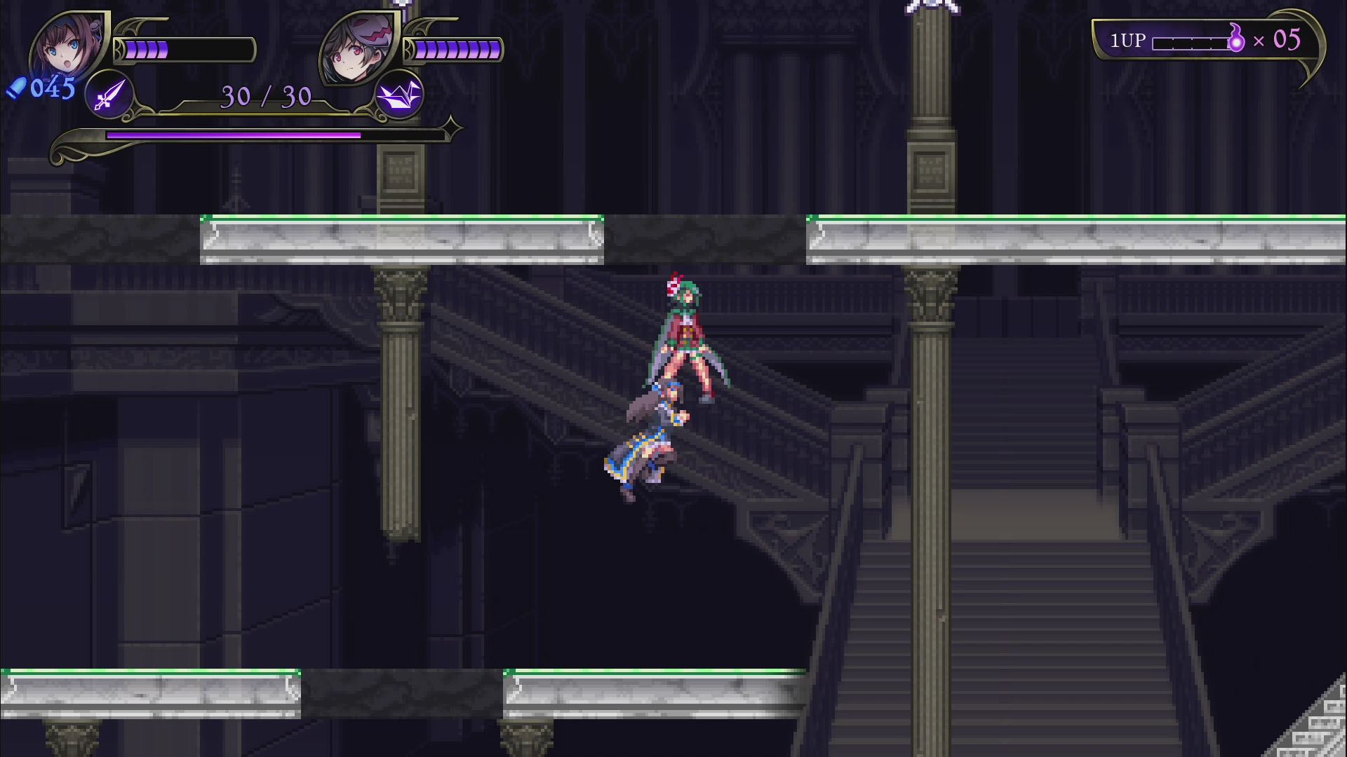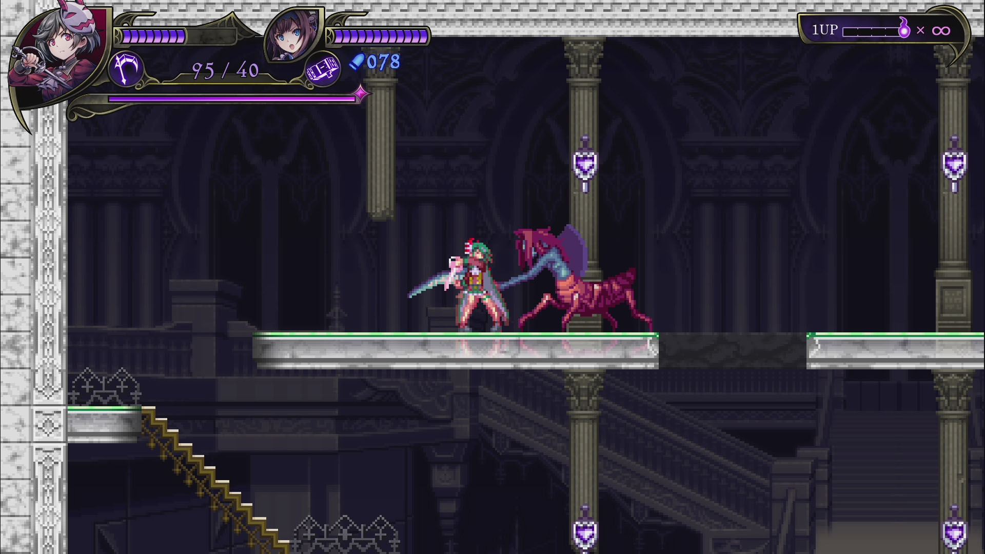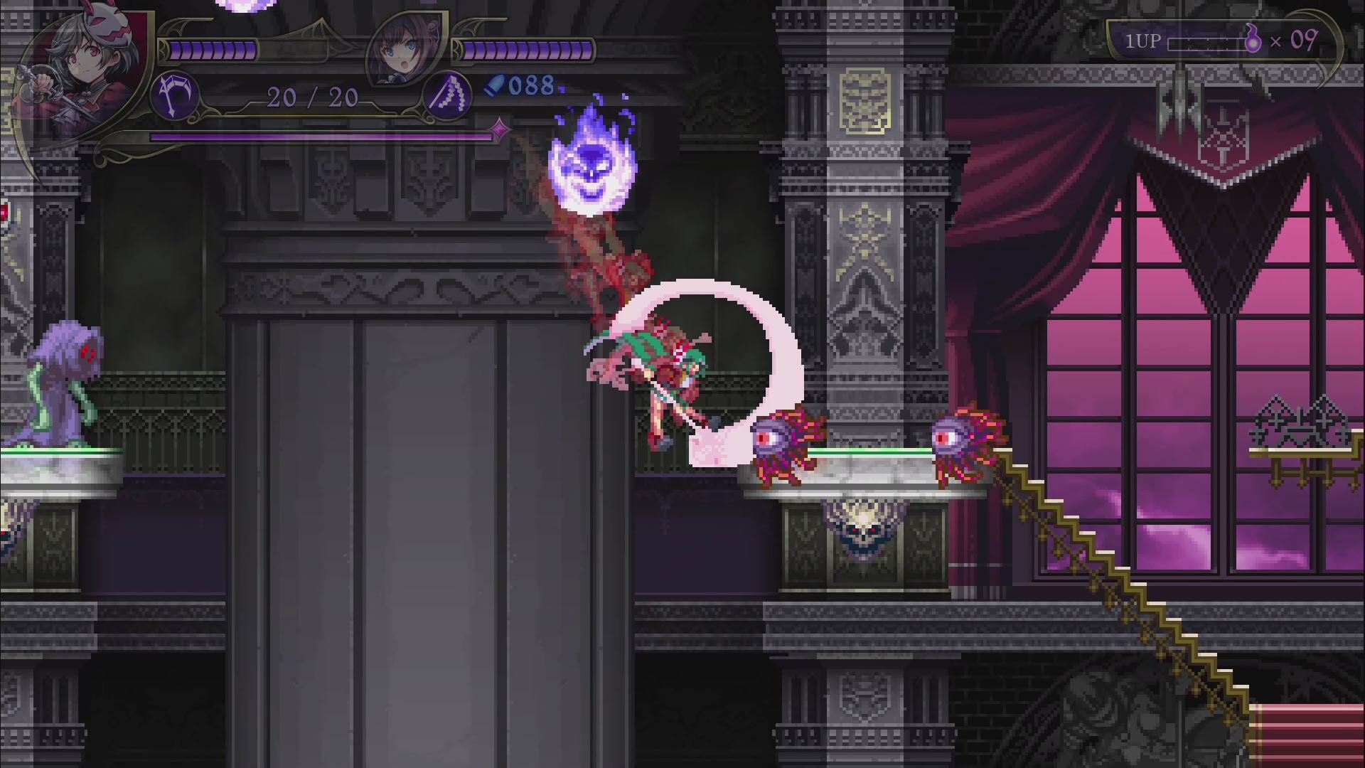 - 록맨, 건볼트 등의 개발사 인티 크리에이츠의 신작으로, 악마의 성이 된 학교를 원래대로 되돌리기 위해 '악마헌터'인 2명의 자매가 싸우는 2D 횡스크롤 액션 게임. 플레이어는 성능이 다른 두 캐릭터를 사용하면서 보스가 기다리고 있는 스테이지 끝을 목표로 진행한다. 보스 악마를 쓰러뜨리면 새로운 무기를 획득하고, 다음 스테이지에서는 새로운 루트를 탐험할 수 있다. 2인 동시 플레이에도 대응하며 두 캐릭터를 동시에 움직이는 연계 액션, 플레이어가 자유롭게 난이도를 선택하는 '스타일 시스템', 풀 보이스 음성 지원, 주회차 플레이에서 변화하는 게임 플레이 등 인티 크리에이츠 작품 특유의 게임성과 고딕 호러 취향을 즐길 수 있는 작품.