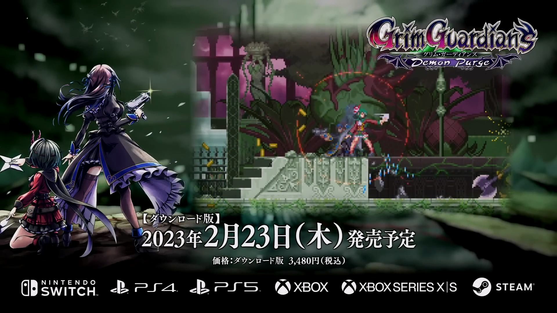 인티 크리에이츠는 2명의 '악마헌터' 자매를 주인공으로 한 2D 횡스크롤 액션 게임 < 그림 가디언즈: 데몬 퍼지(Grim Guardians: Demon Purge) >를 2023년 2월 23일 PS, Xbox, Switch, PC(스팀, 한국어 지원)로 출시한다고 밝혔고 새로운 영상과 게임 정보를 공개하였습니다.