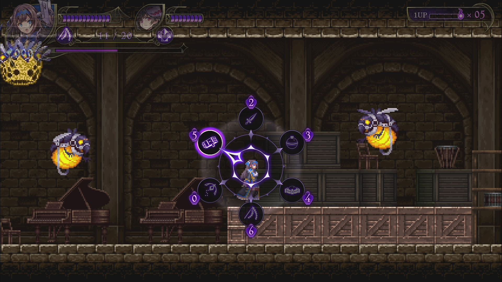 - 서브 웨폰 - 웨폰 포인트를 소비해 사용할 수 있는 퇴마도구(서브웨폰)도 자매마다 특징이 다르다. '던지는 나이프'는 대각선 상공으로 칼을 던져 공격할 수 있어 공중에 있는 악마에게 유효하다. '식신(시키카미)씨'는 악마에게 피해를 주는 식신을 만들어내는 마야의 서브웨폰. 식신은 적의 공격을 일부 막아주지만 지속시간을 소비한다.